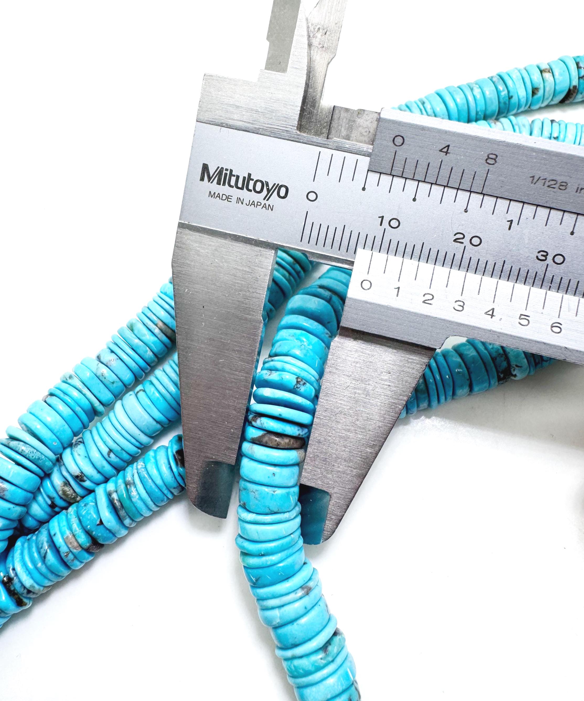 Sourced from the world-renowned Kingman Mine, these turquoise heishi beads are precision-cut into sleek, uniform discs. They feature the iconic sky-blue hue that Kingman is famous for, interspersed with beautiful natural matrix character. These beads are perfect for creating smooth, flowing designs that lay comfortably against the skin.