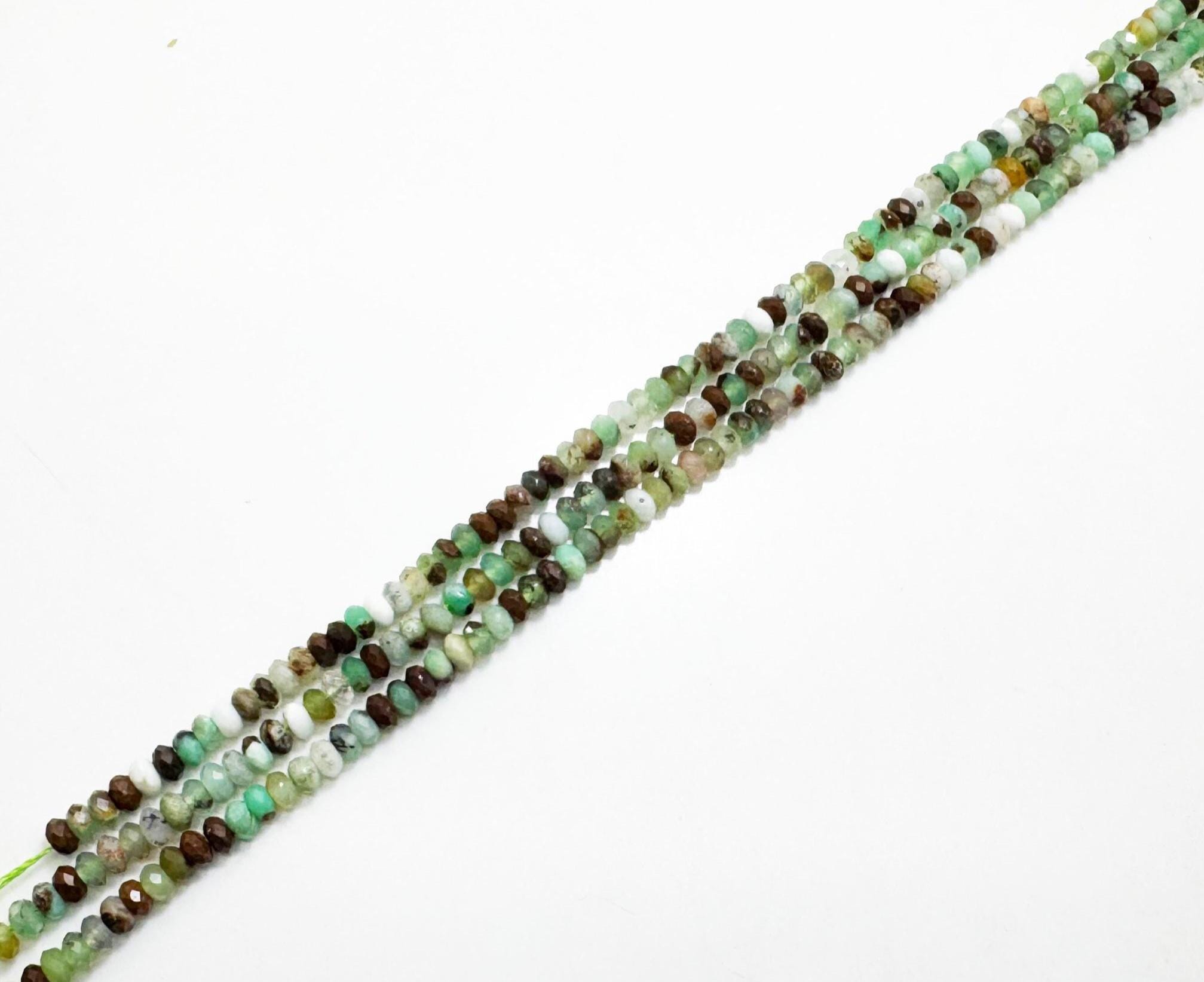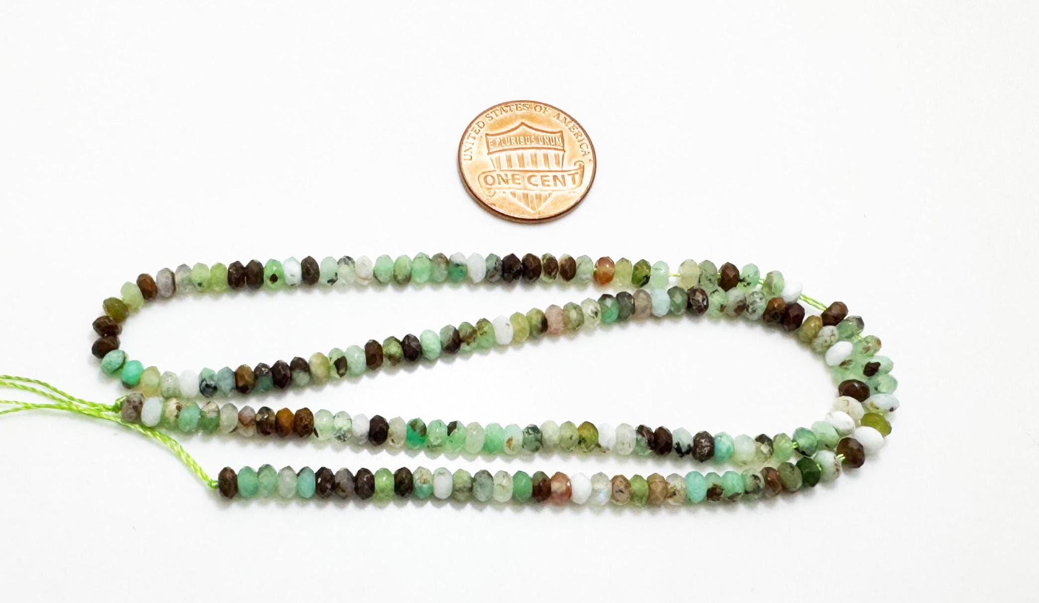 These beautiful chrysoprase beads showcase a fresh apple-green to soft mint green color, enhanced by fine faceting for gentle sparkle. The 3mm x 4mm rondelle shape is perfect for elegant, lightweight jewelry designs and detailed beadwork.