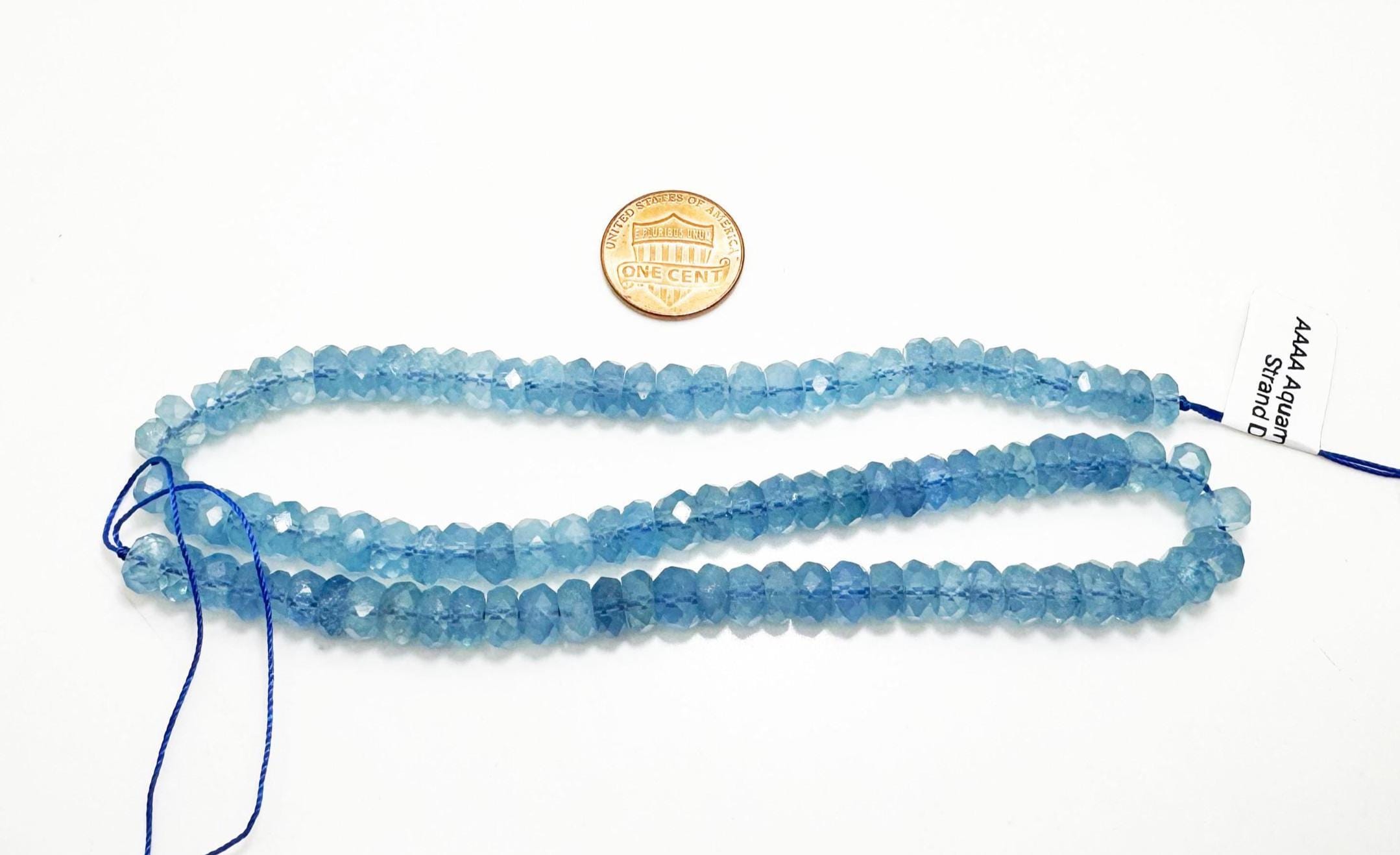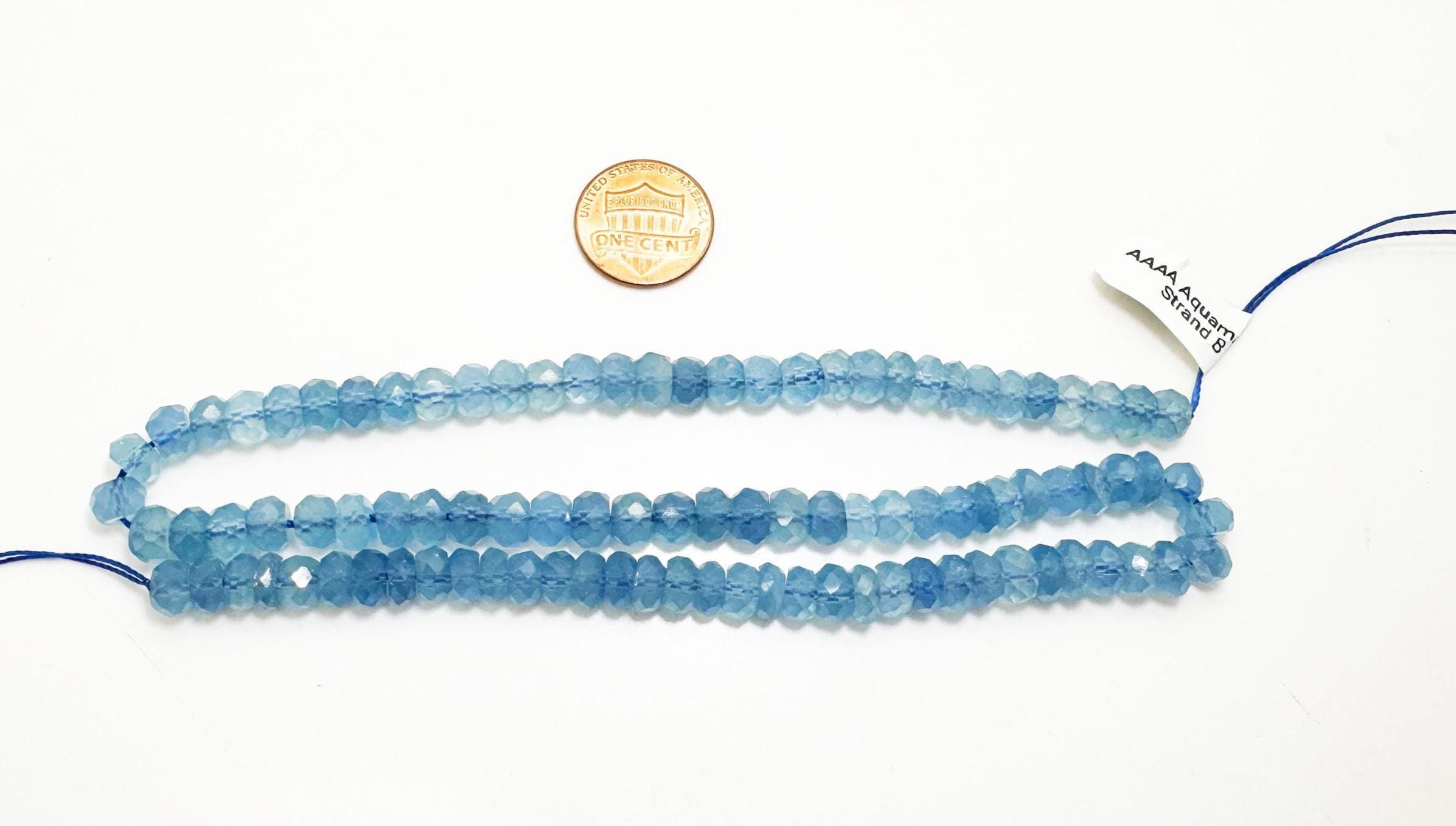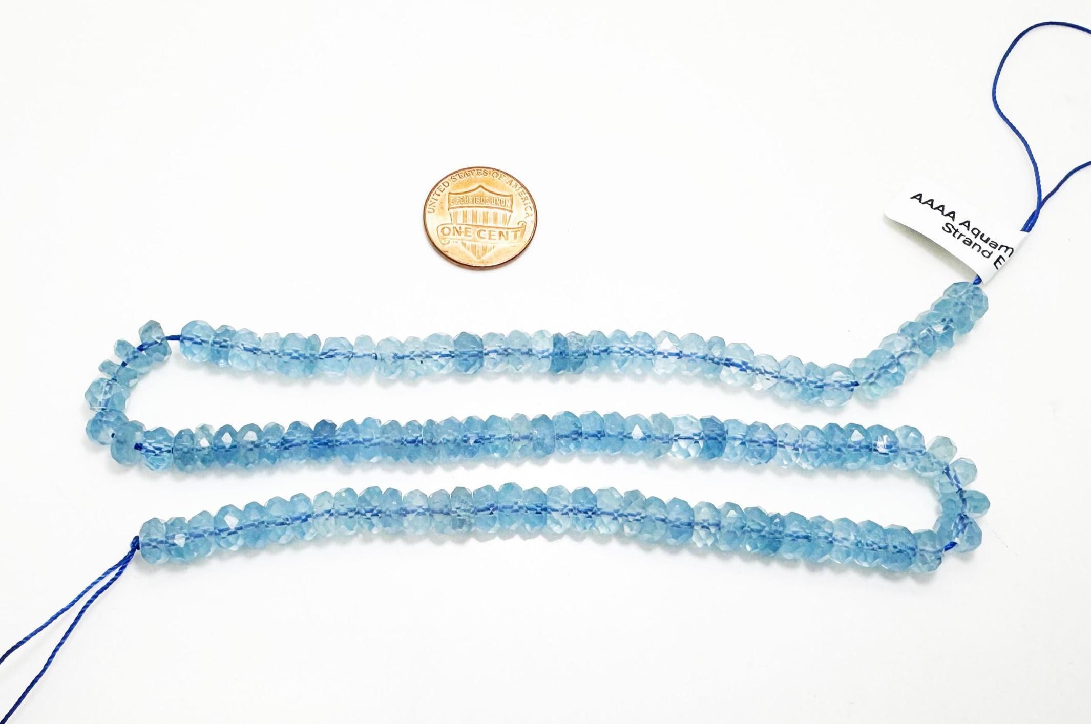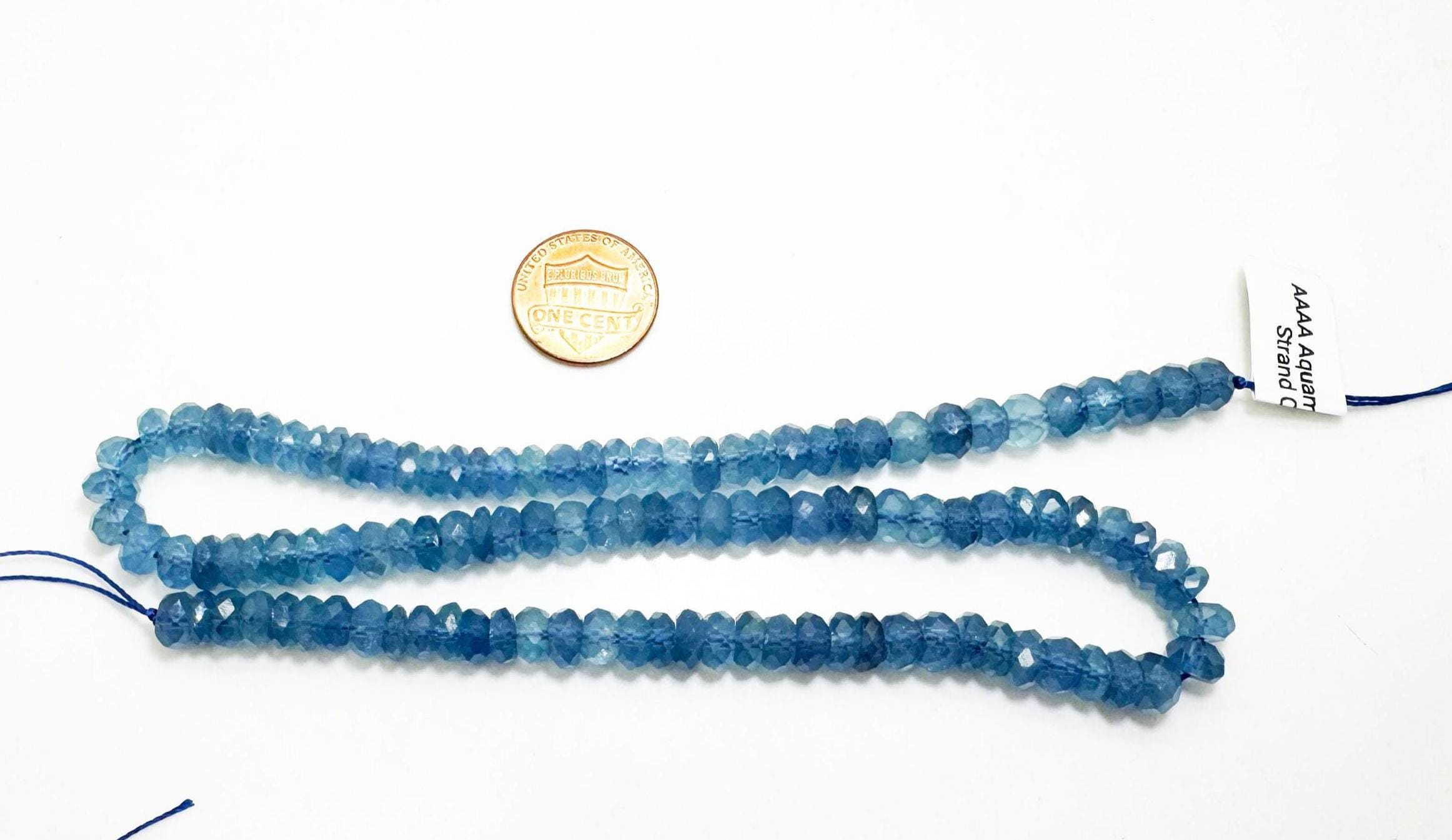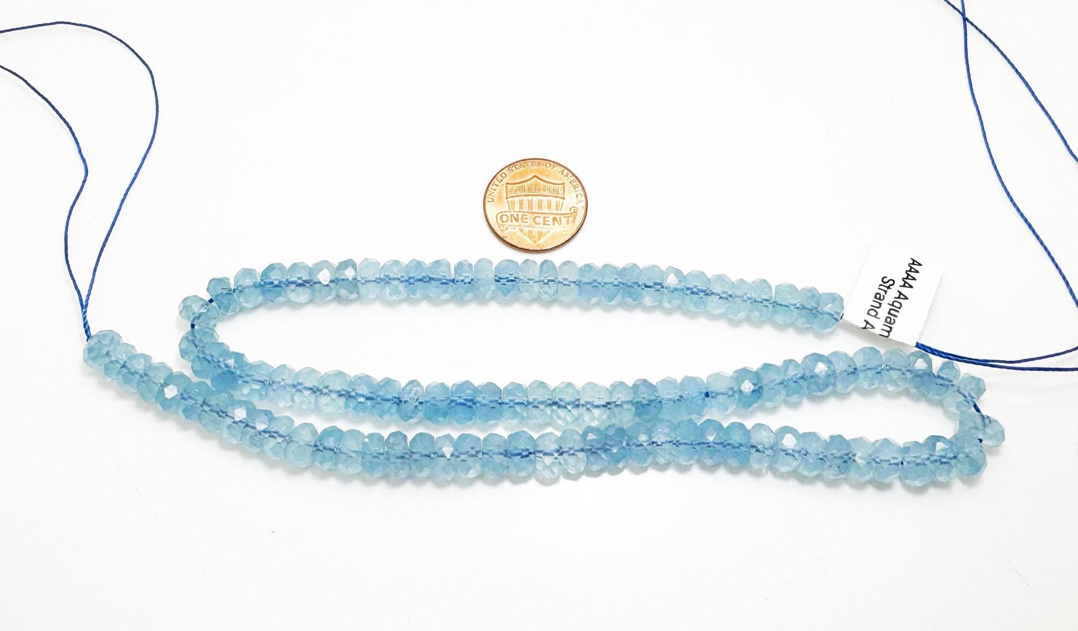 These exquisite AAAA-grade Aquamarine faceted rondelle beads feature a luminous soft blue hue with dazzling sparkle from their precision faceting. Each bead measures approximately 4mm ~ 5mm x 7mm, with about 100 beads per strand—perfect for creating dainty necklaces, elegant bracelets, earrings, or accent designs in fine jewelry. Their superior quality and brilliance make them a standout choice for jewelry designers.