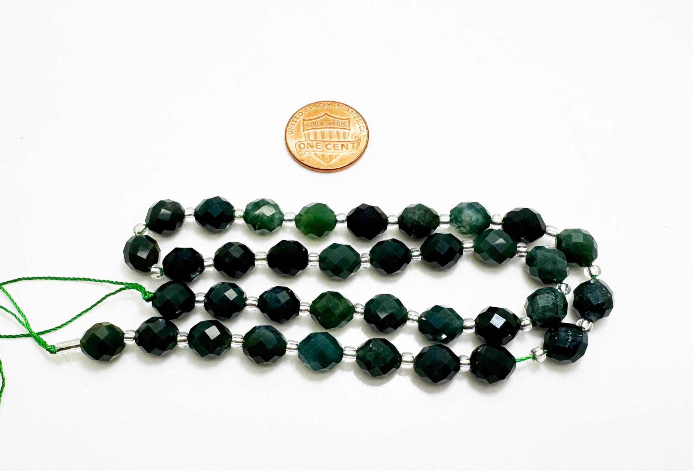 These lovely green moss agate beads feature soft white to translucent bases with natural moss-like green inclusions. Each bead has its own organic pattern, giving the strand a beautiful earthy and botanical feel. The faceted oval cut adds gentle sparkle while preserving the stone’s natural character.