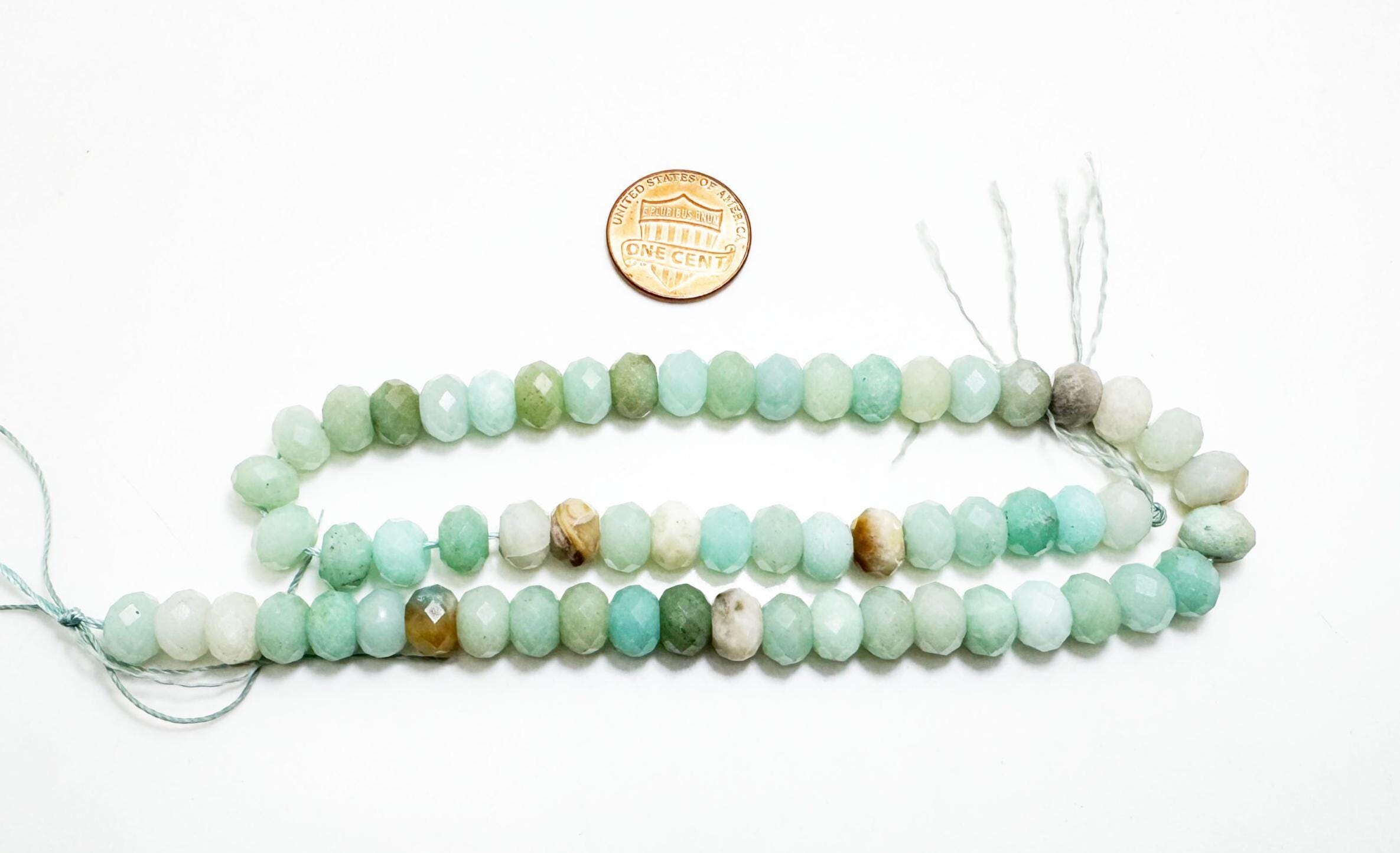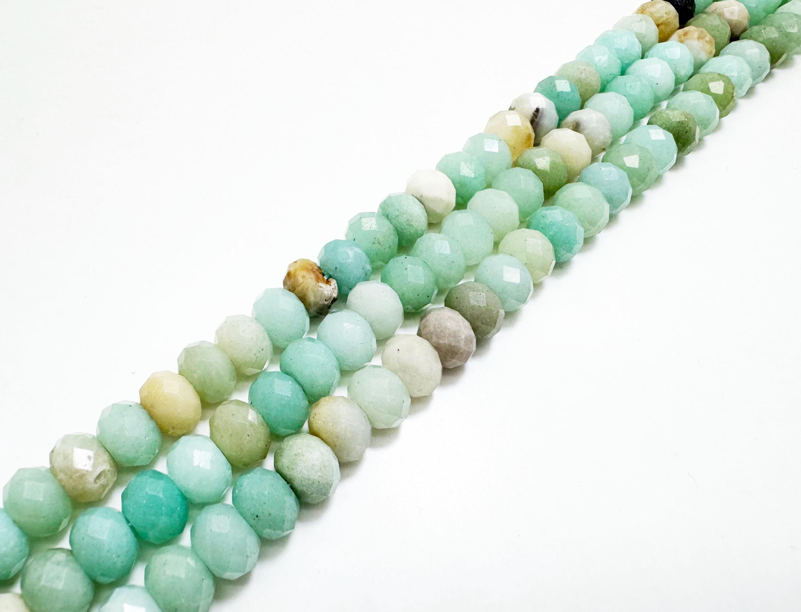 These faceted rondelle Green Amazonite beads display soft to medium green tones with natural variations and gentle translucency. Their fresh, calming color makes them a beautiful choice for both everyday jewelry and statement designs.