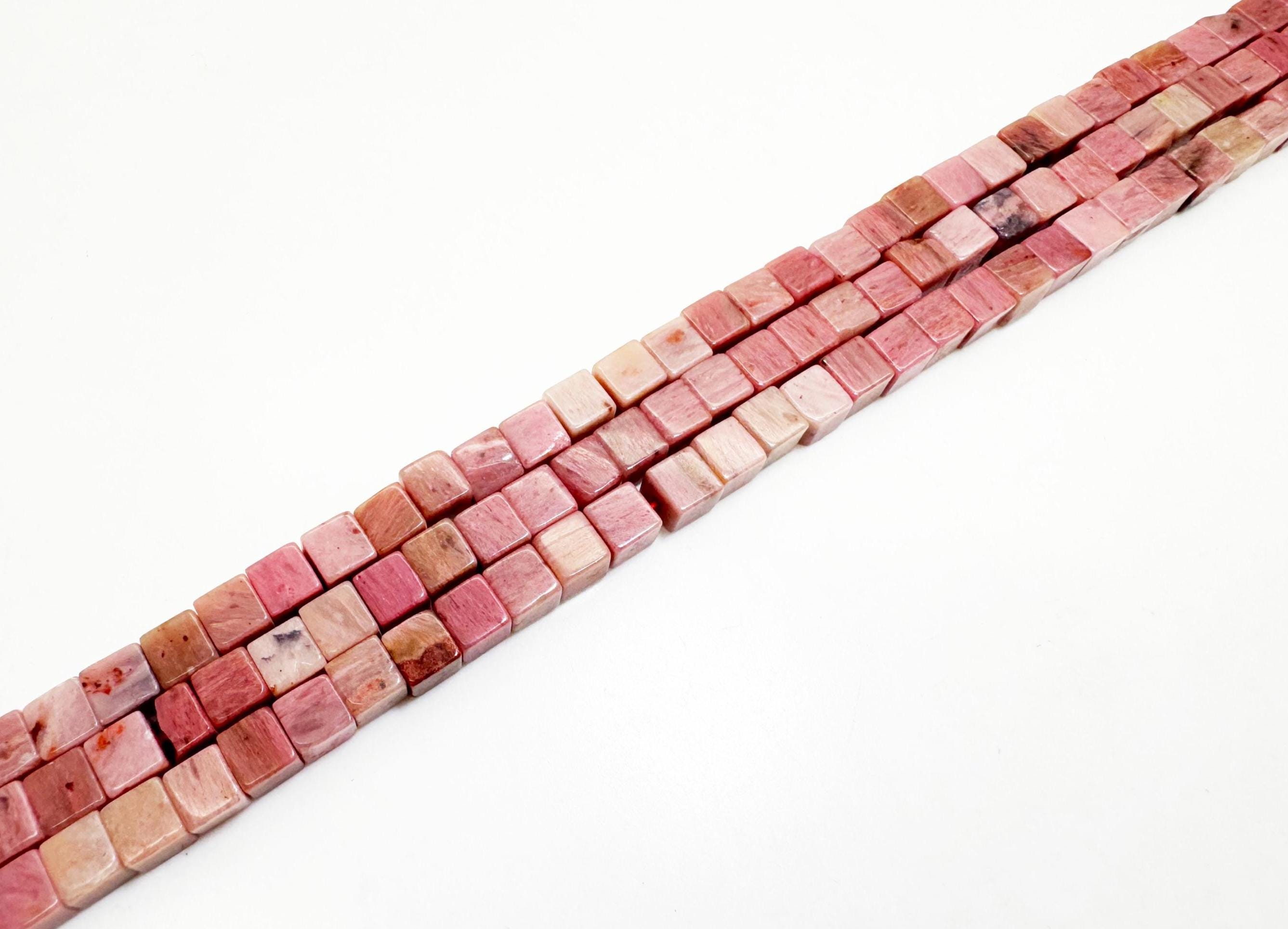 These beautiful rhodonite beads feature a polished cube shape with soft pink tones accented by natural black veining. Their unique patterns and gentle colors make them perfect for both modern and earthy jewelry designs.