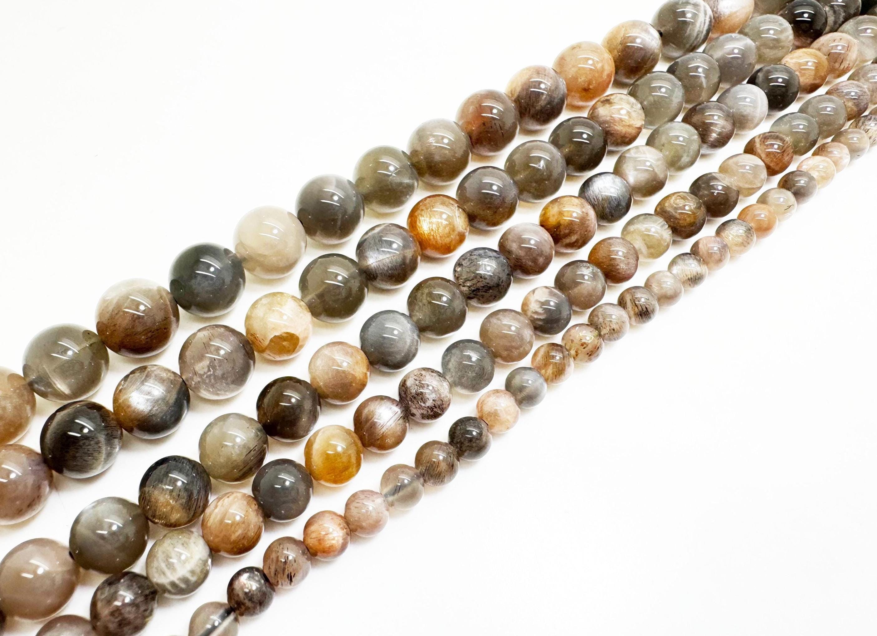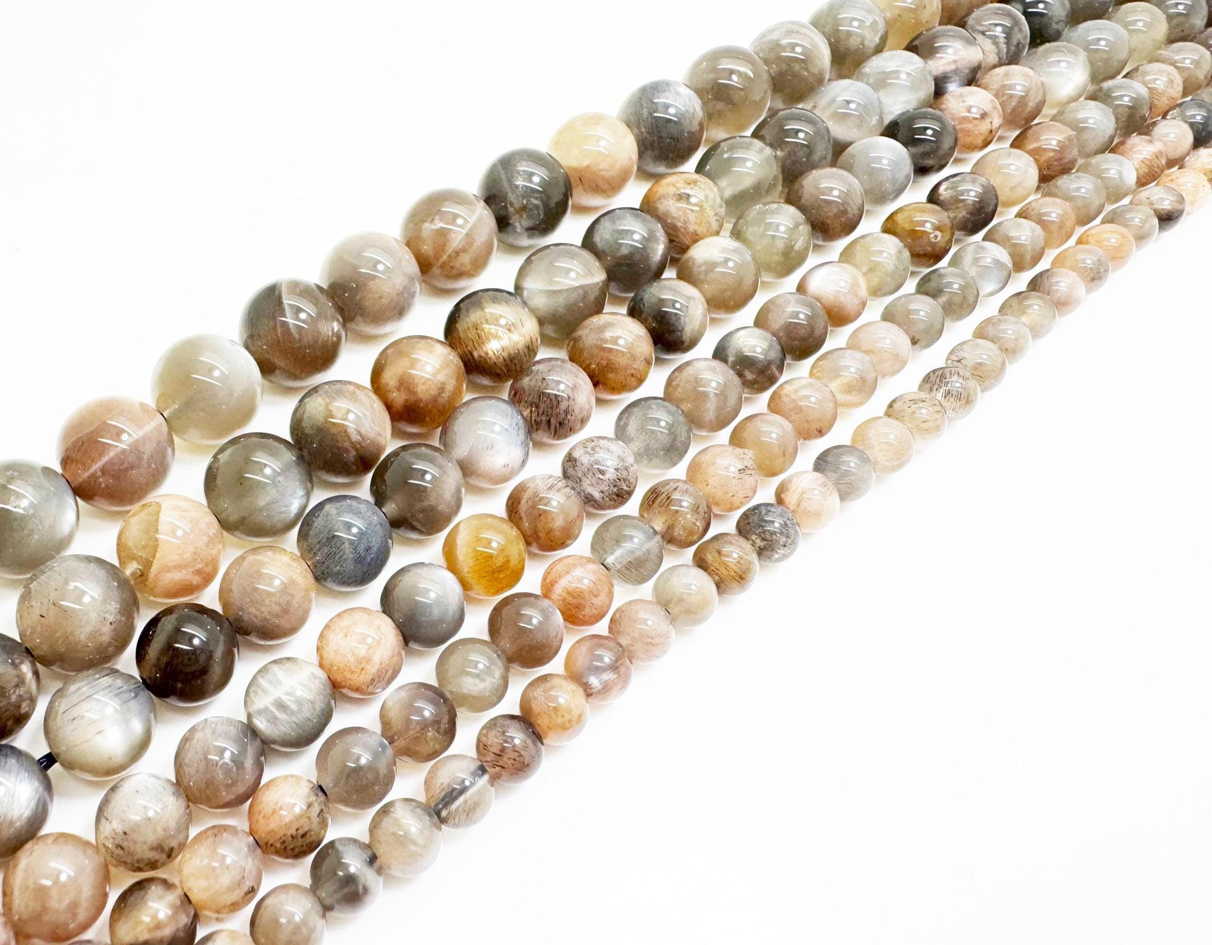 These beautiful beads feature a natural blend of moonstone’s soft glow with sunstone’s warm golden sparkle. The neutral gray, beige, and peach tones create an elegant, earthy palette with subtle shimmer that catches the light beautifully.