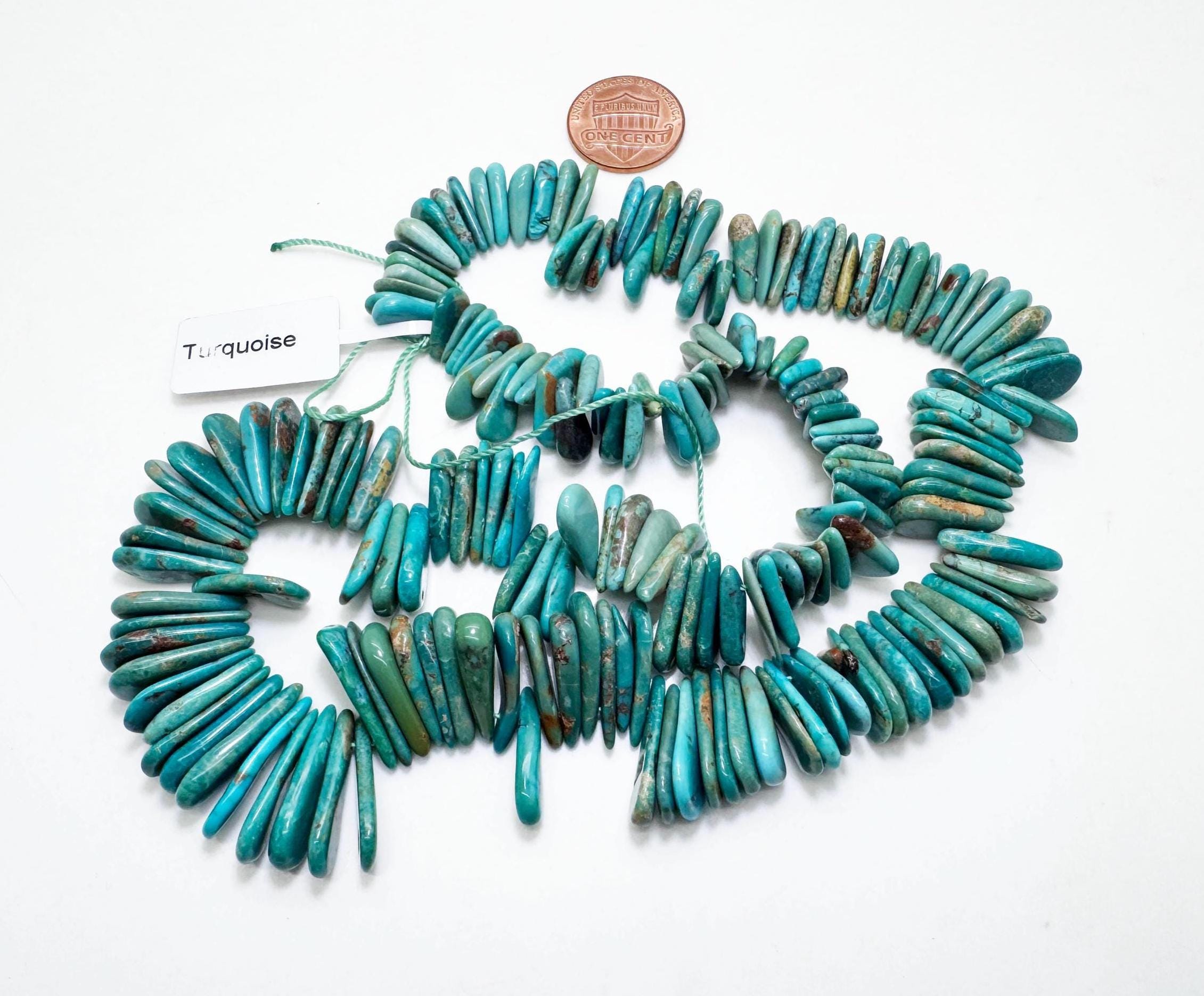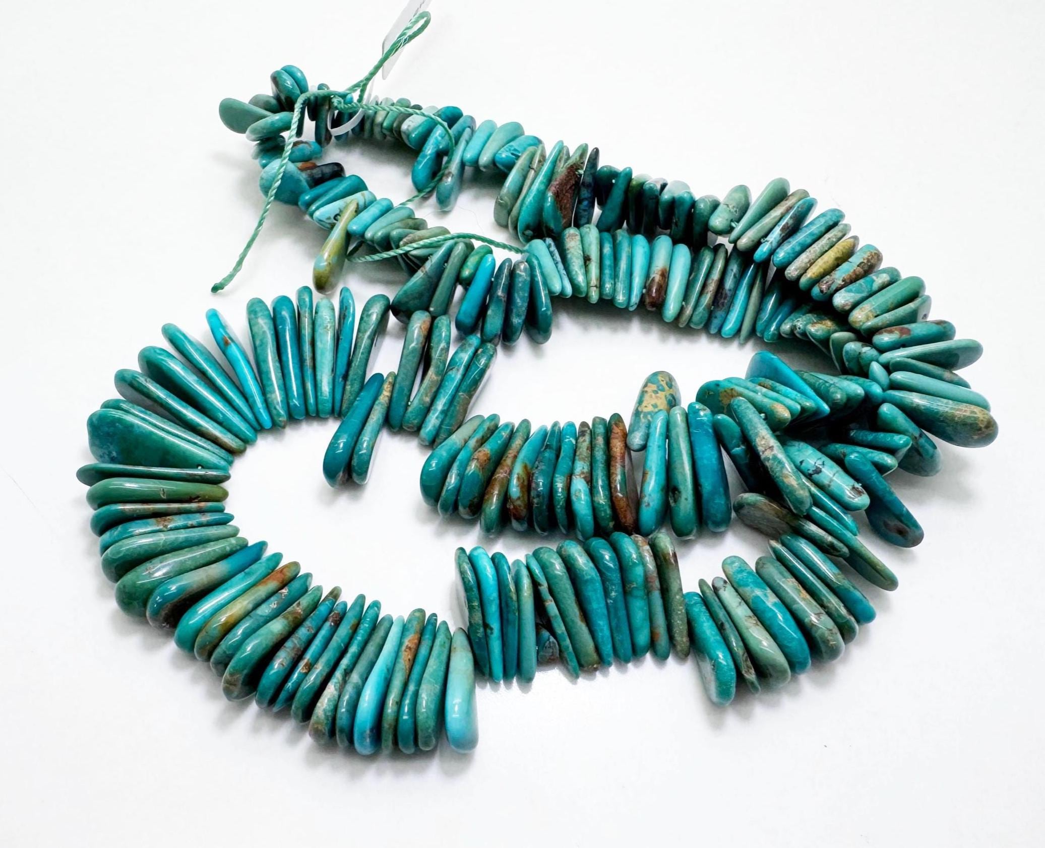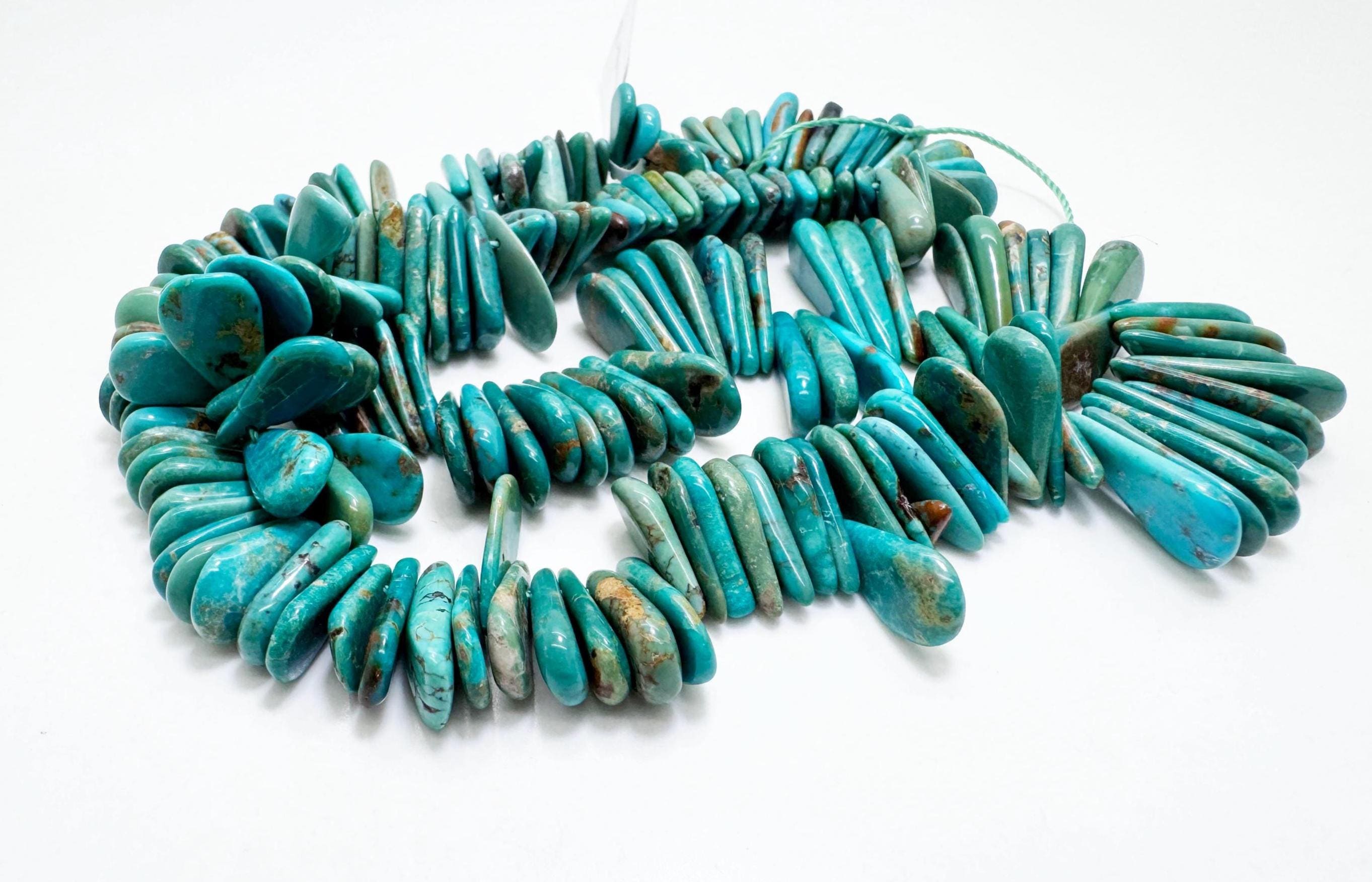 Beautiful natural Hubei turquoise nugget beads featuring soothing blue-green tones with earthy natural matrix. These freeform slices are arranged in a graduated strand, creating a flowing organic look perfect for bold handmade jewelry.