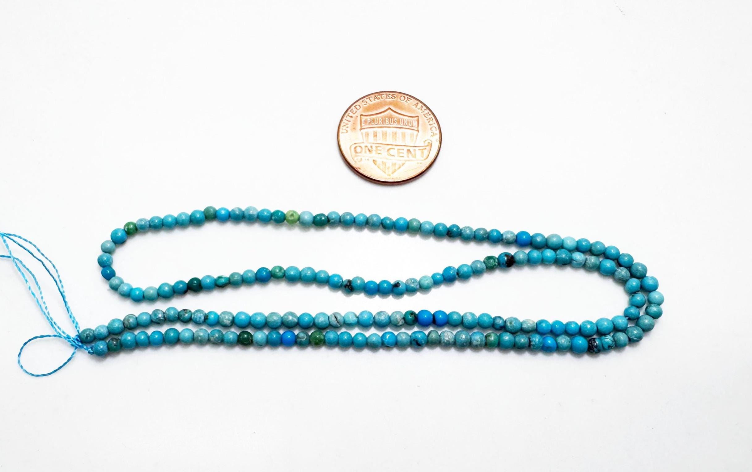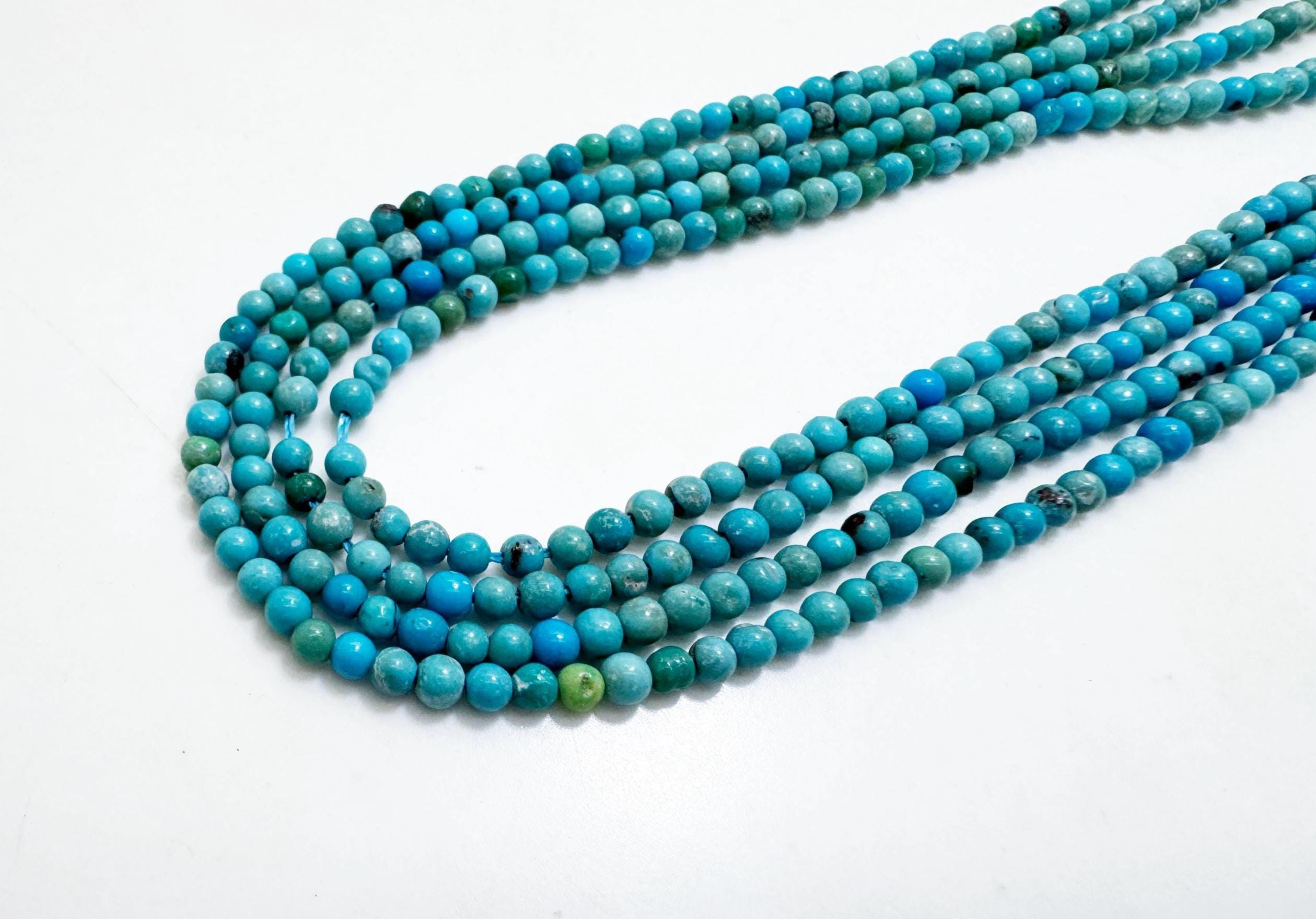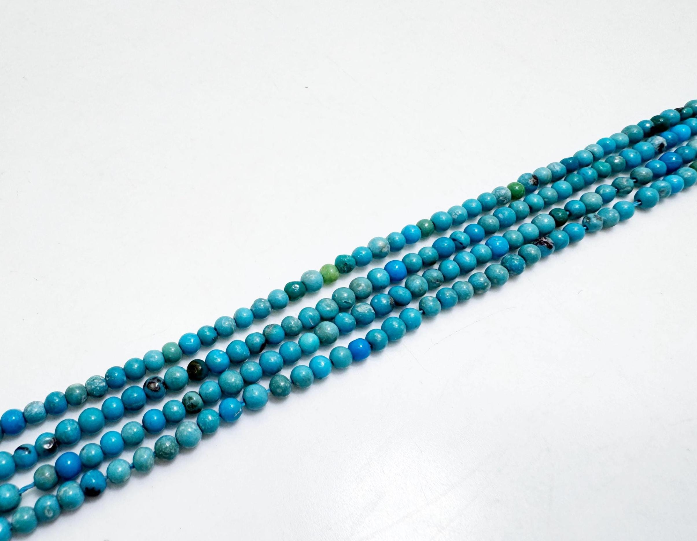 These beautiful natural turquoise round beads measure about 3mm in size and come on a full strand of approximately 110 beads (length ~15.5"). With their classic sky-blue to blue-green tones and natural matrix patterns, these beads are perfect for fine jewelry designs such as delicate necklaces, bracelets, and earrings.