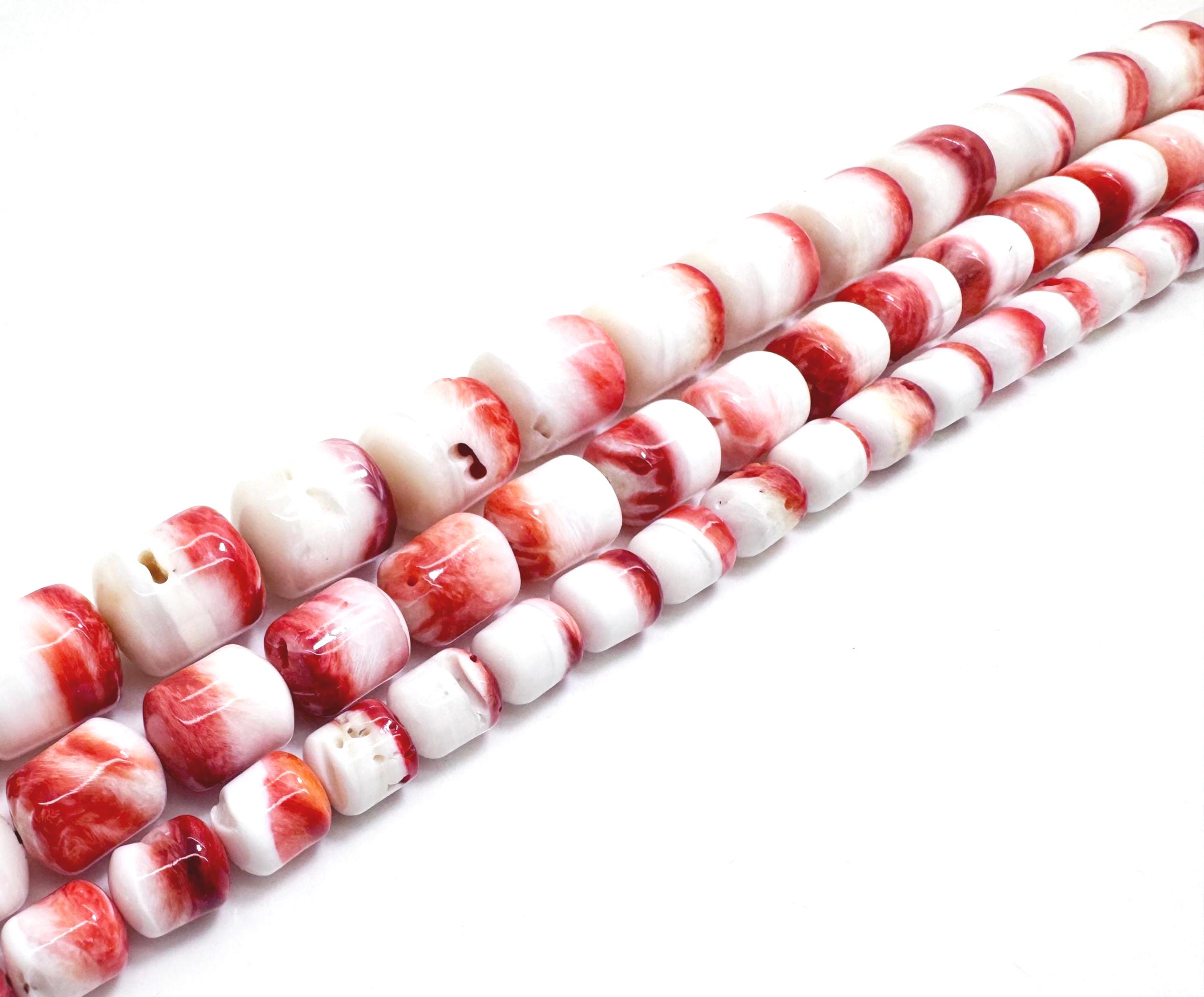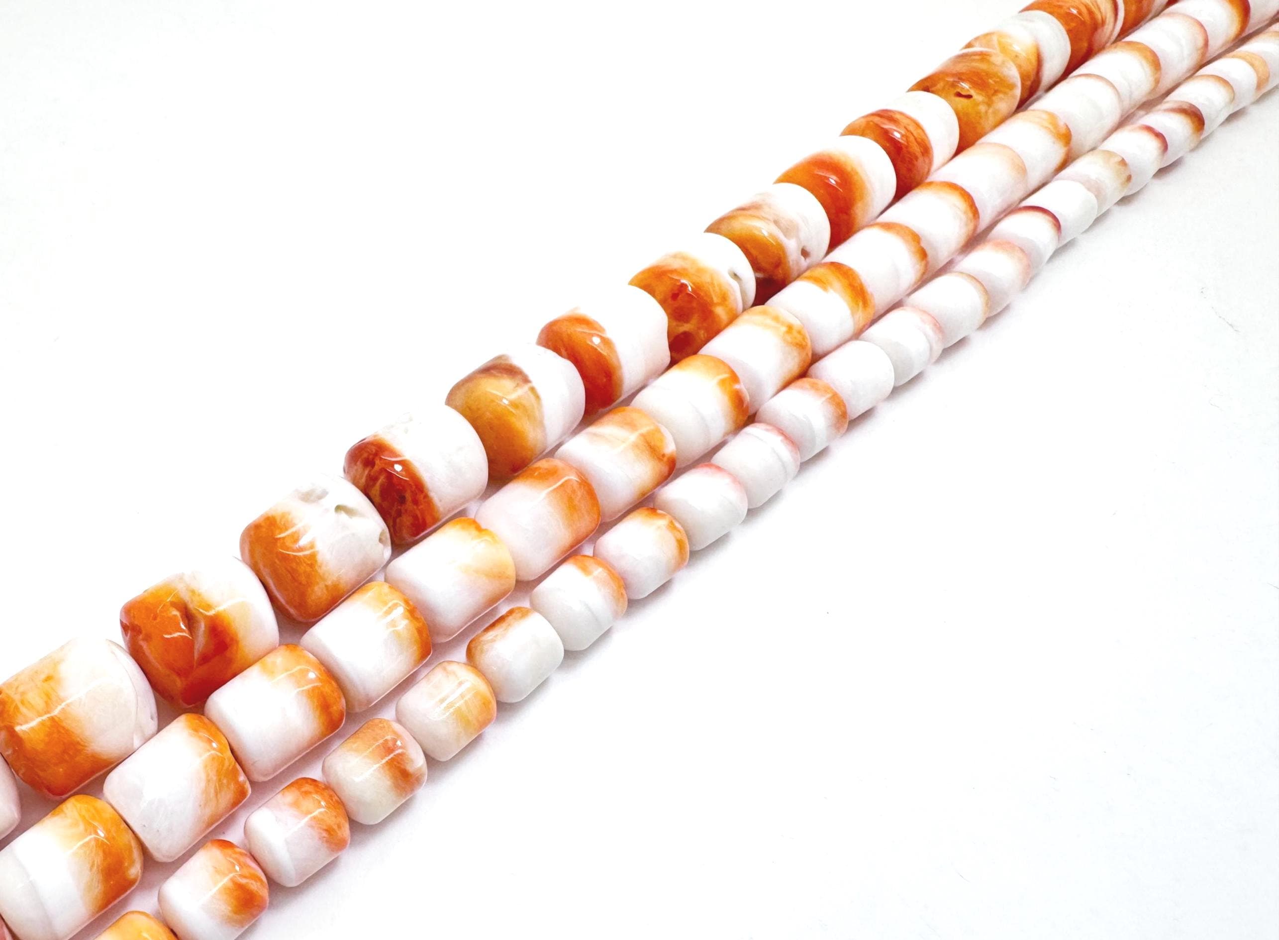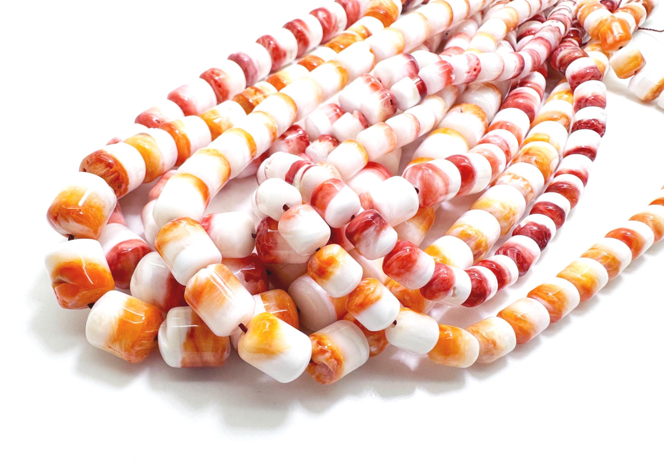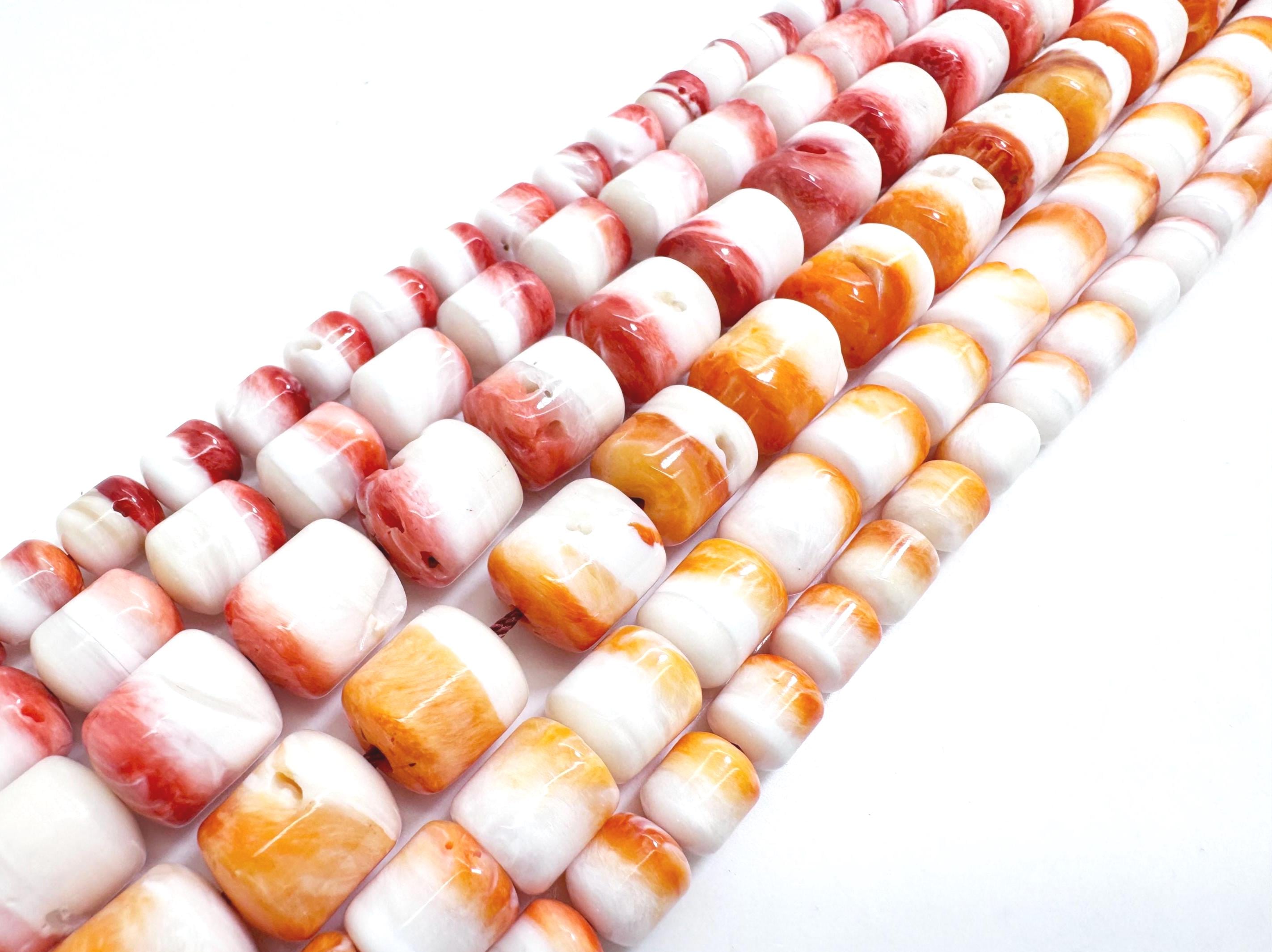 These beautiful barrel-shaped beads feature a striking blend of creamy white with vibrant orange and coral tones. Each bead has a smooth, polished surface with natural ocean-inspired patterns, making them perfect for statement jewelry.
