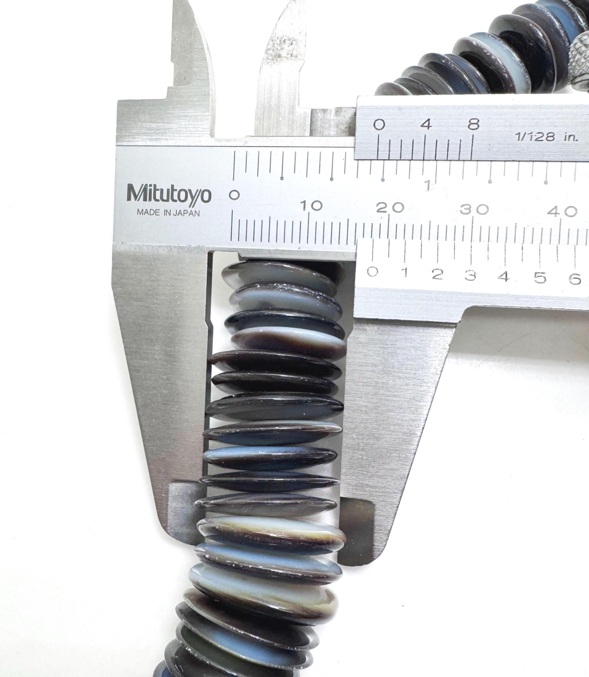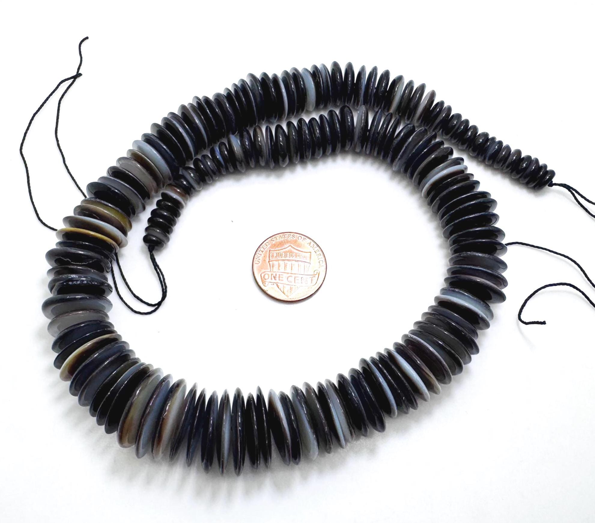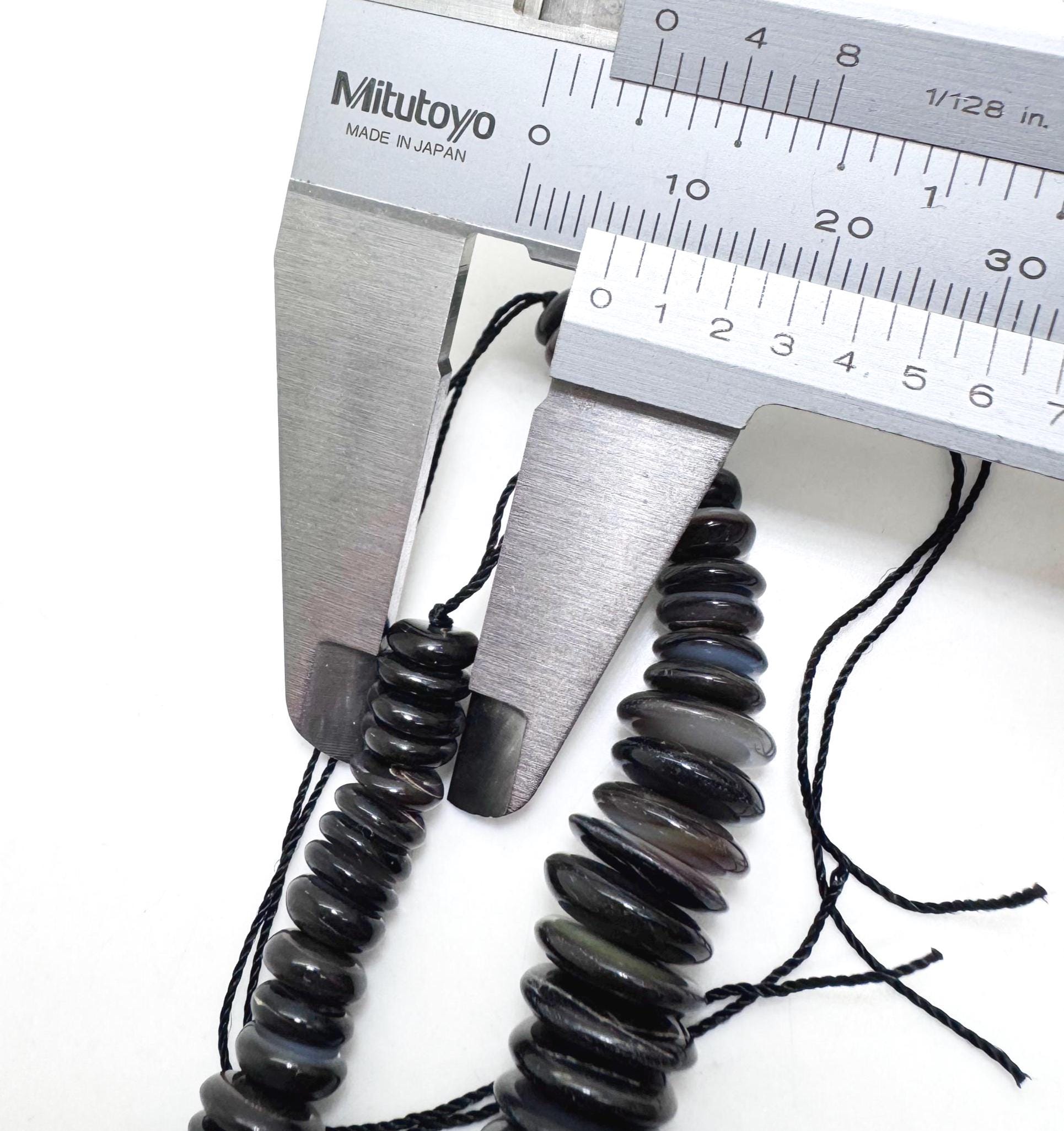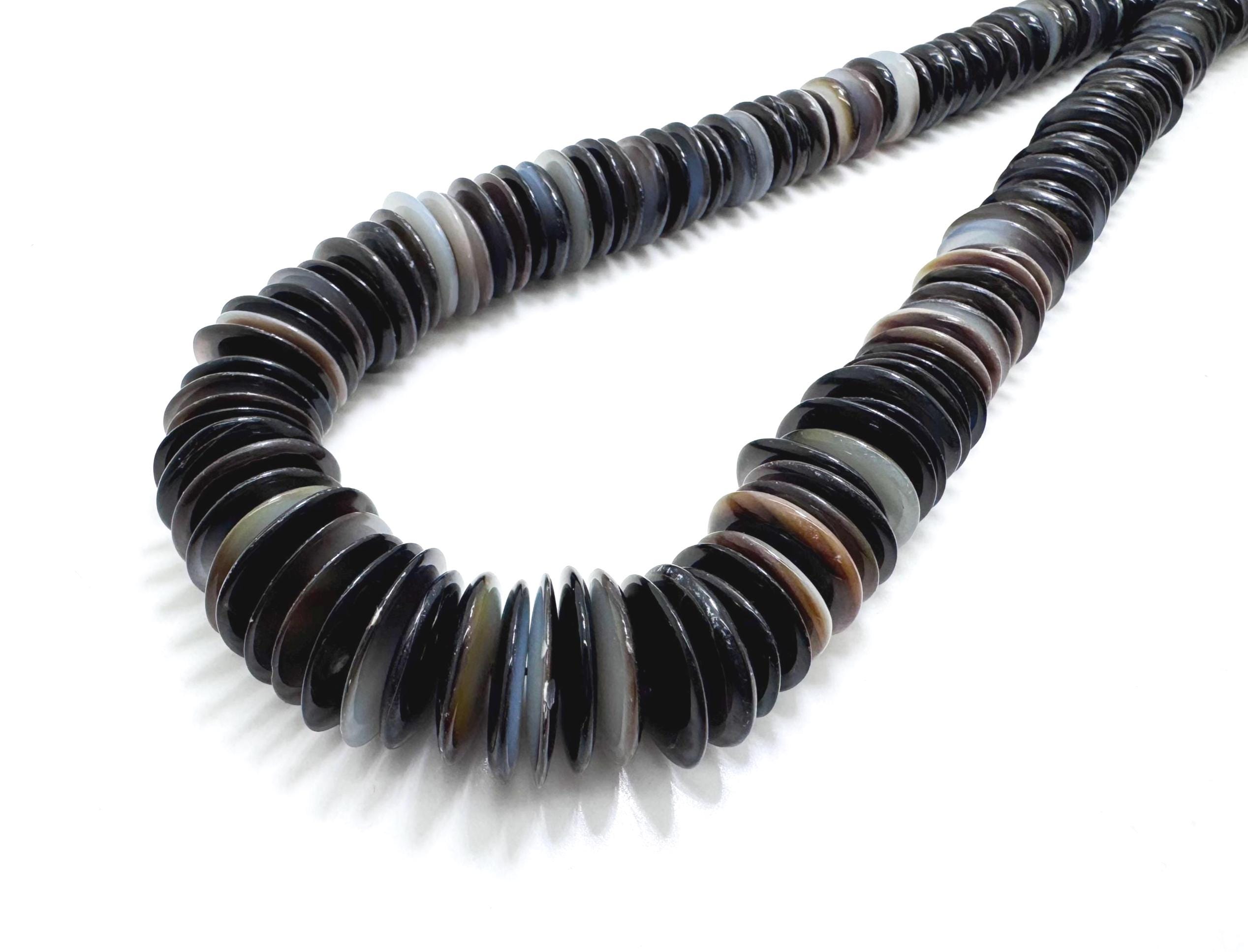 These stunning graduated disc beads are crafted from the inner lining of the Black Lip Oyster (Pinctada margaritifera), the same shell that produces the famous Tahitian Black Pearl. Each bead features a mesmerizing play of light, shifting from deep charcoal and midnight black to shimmering silvery-grey and hints of peacock green or purple.