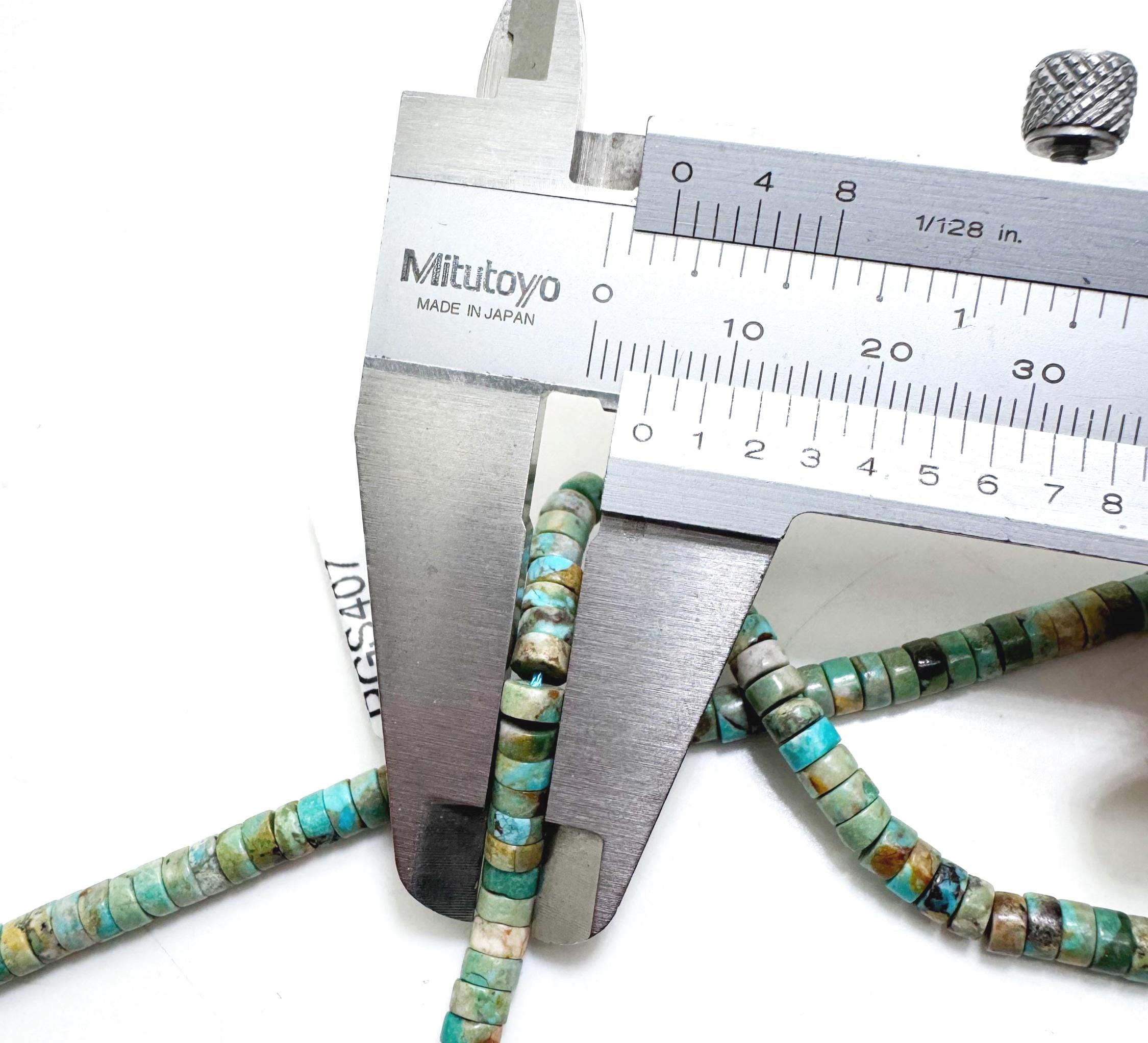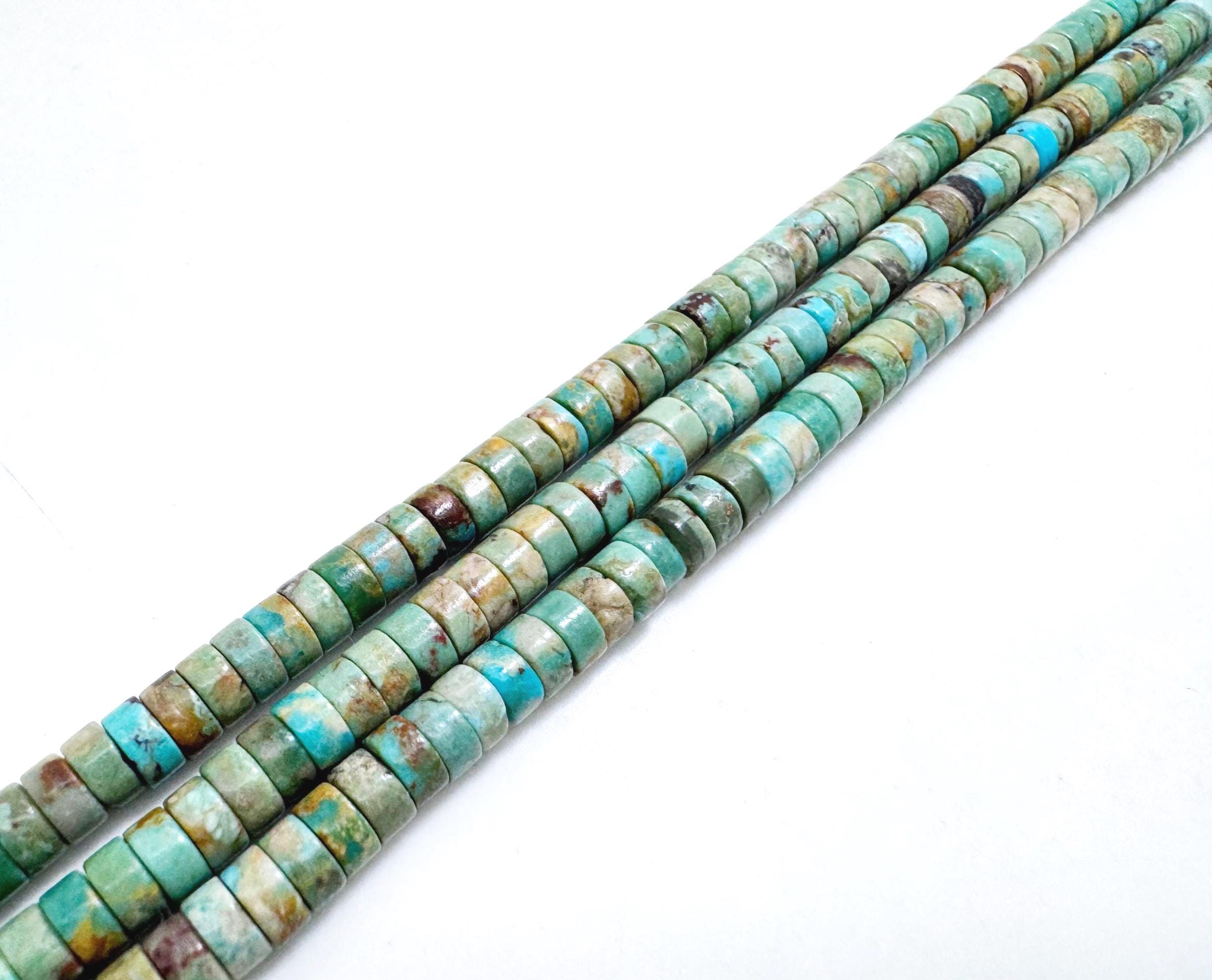 These natural Hubei turquoise beads feature beautiful earthy tones ranging from soft green to teal with natural brown and tan matrix. Cut into classic heishi (rondelle disc) shape, these beads offer a clean, uniform look while still showcasing organic variation.