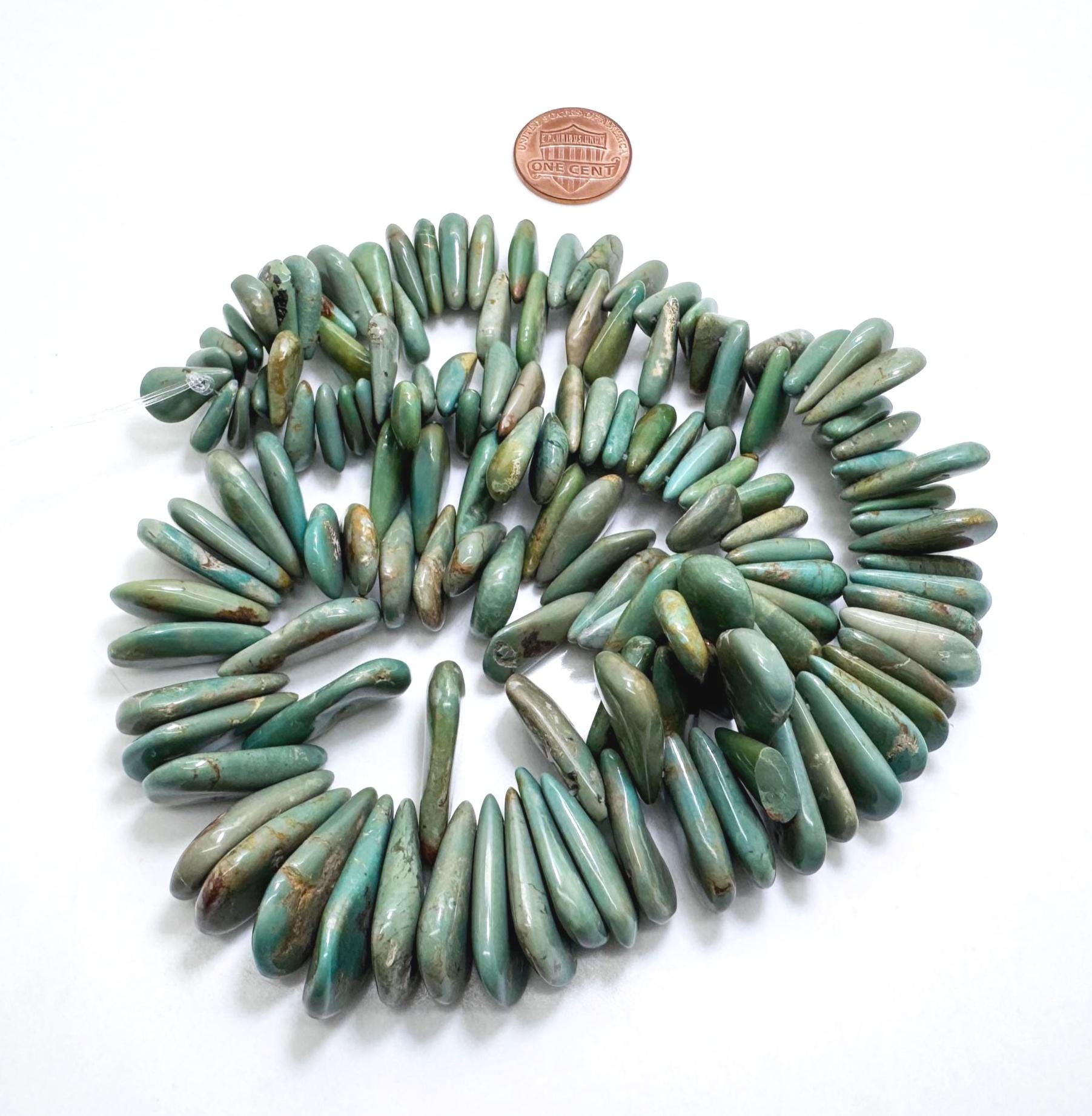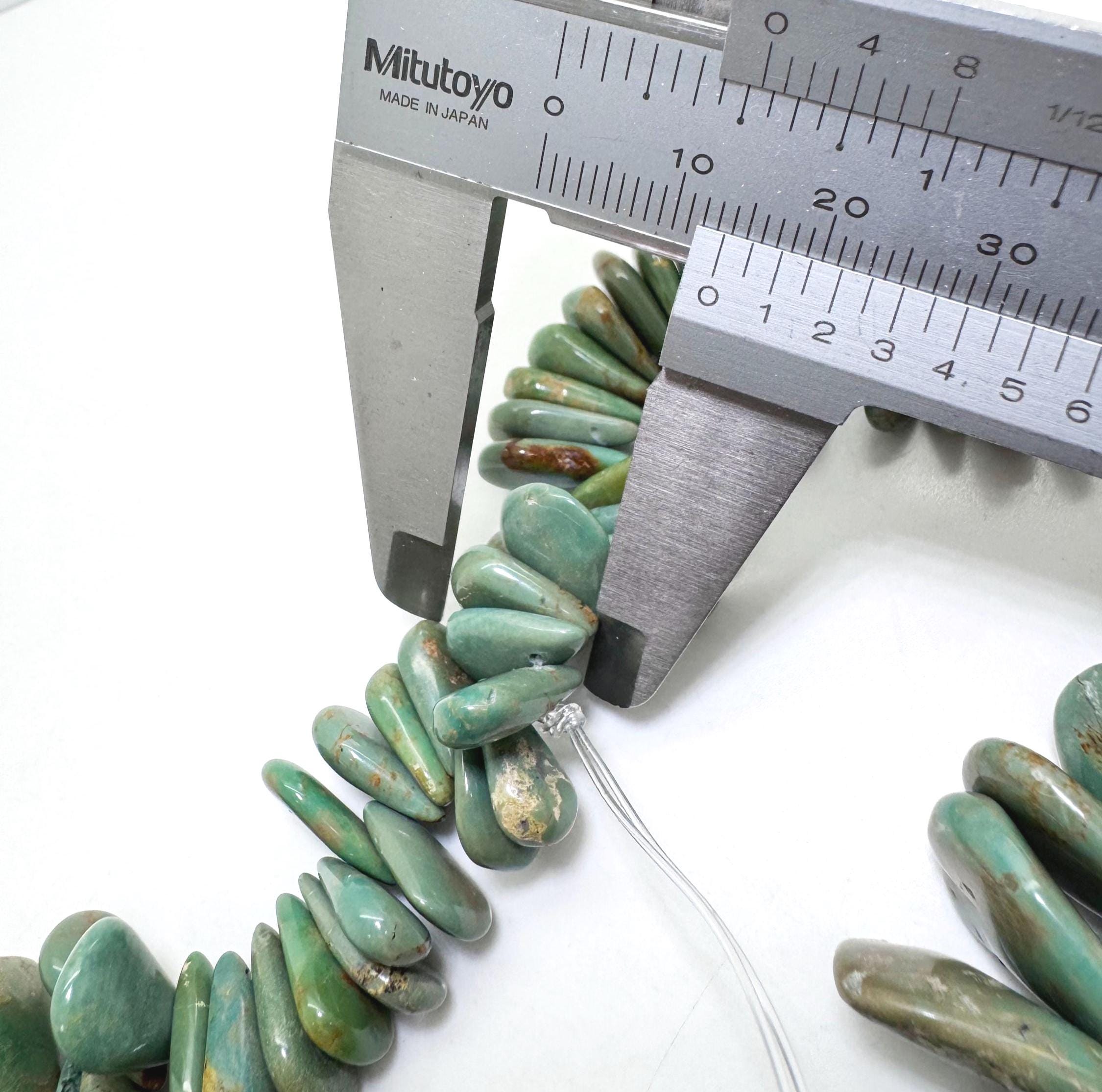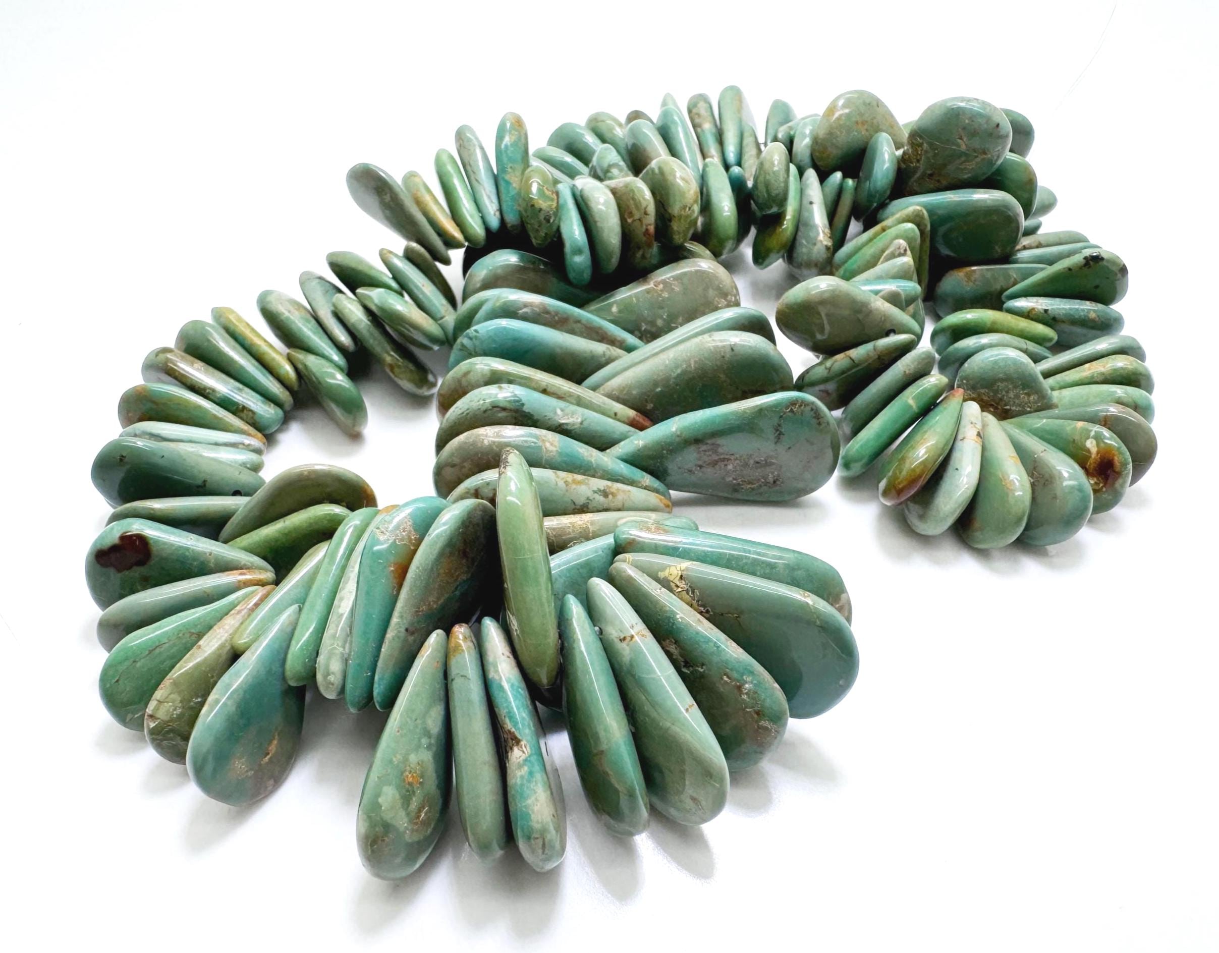 Celebrate the beauty of nature with this striking strand of Hubei Turquoise. These beads are expertly cut into graduated teardrop (pear) shapes, featuring a lush palette of mossy greens, sage, and sand-toned matrix. With a flat-back profile and a substantial size range, these beads are perfect for designs that require a bold, natural focal point.