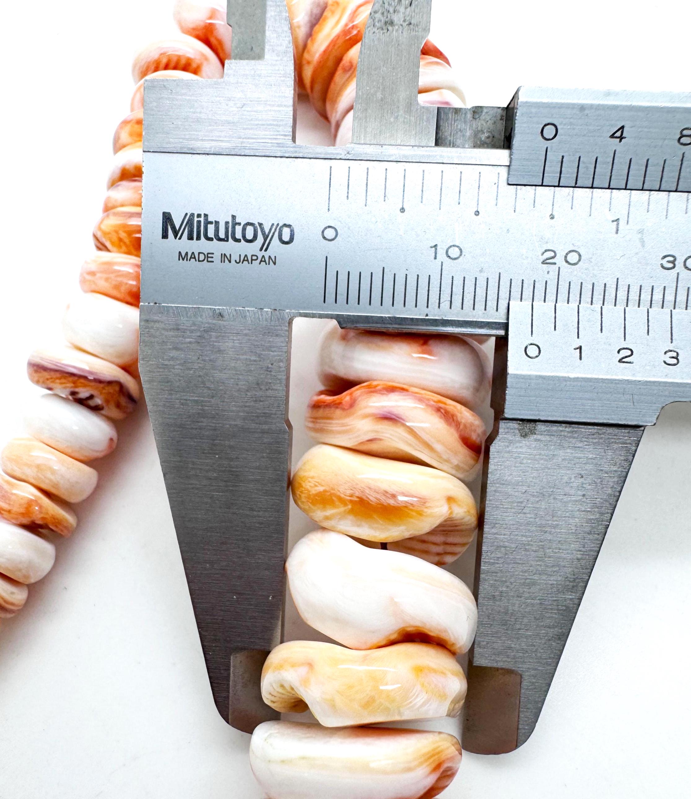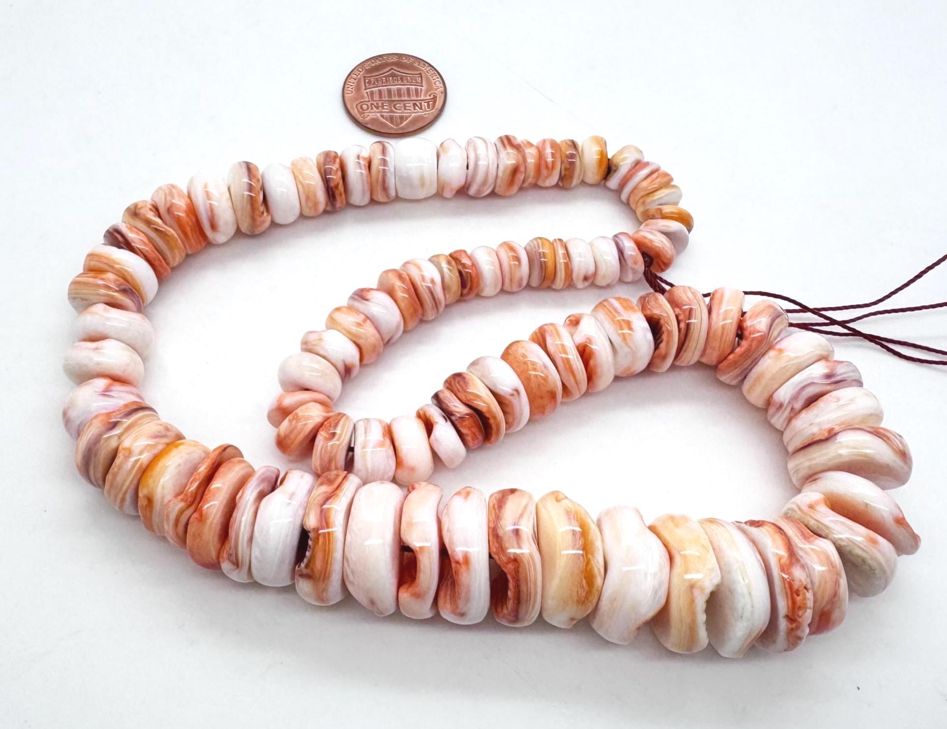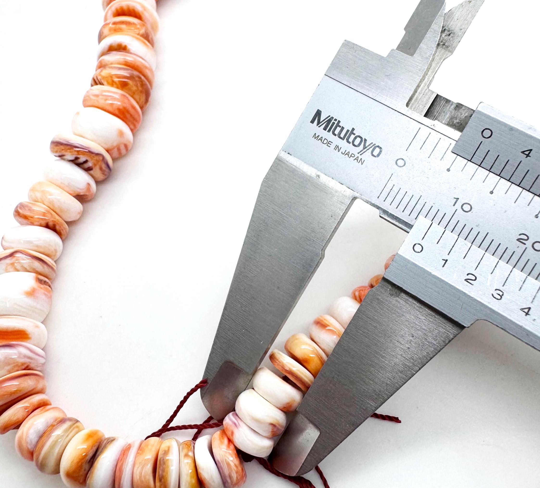 Capture the spirit of the desert and the sea with these stunning Orange Spiny Oyster beads. This premium strand is expertly graduated, tapering from dainty 8mm beads at the ends to a bold, substantial 18mm focal bead in the center. Featuring a smooth rondelle shape and a high-luster polish, these beads showcase a beautiful range of natural orange, tangerine, and creamy white striations.