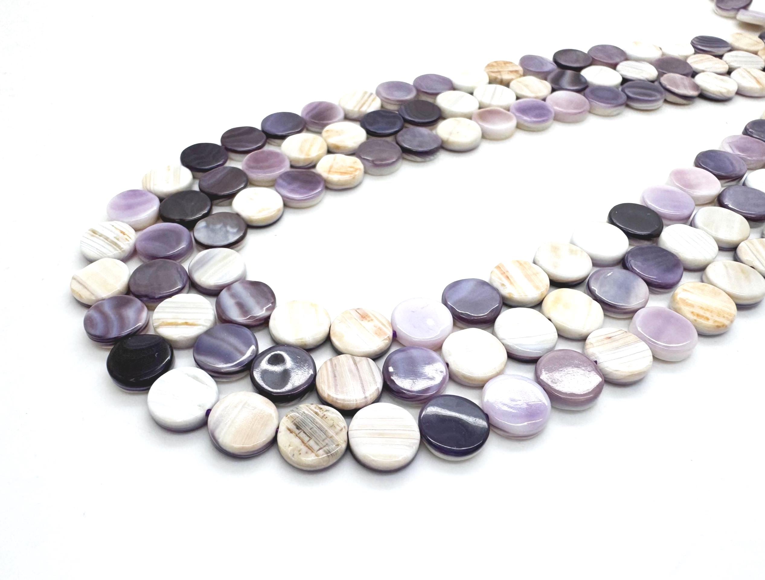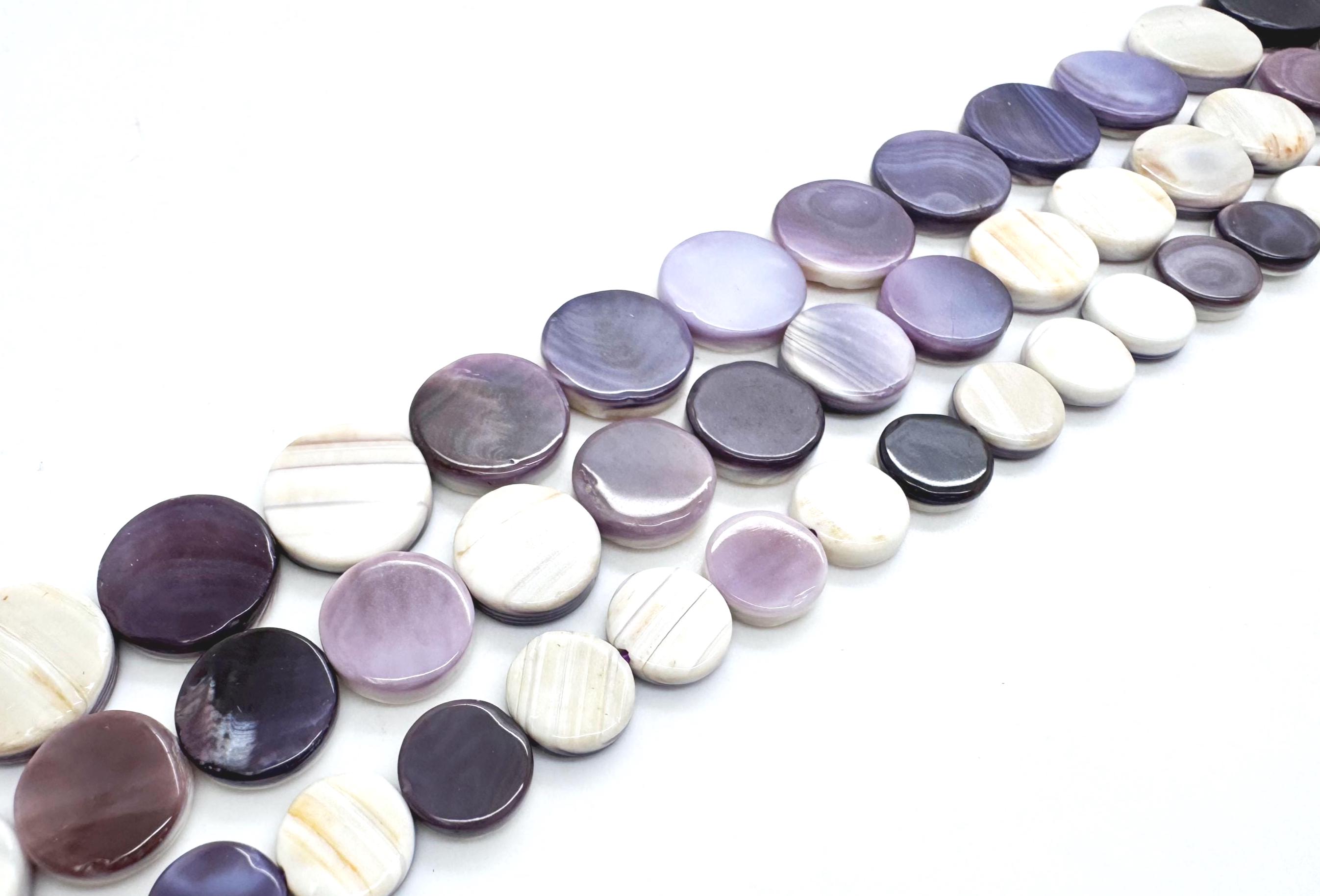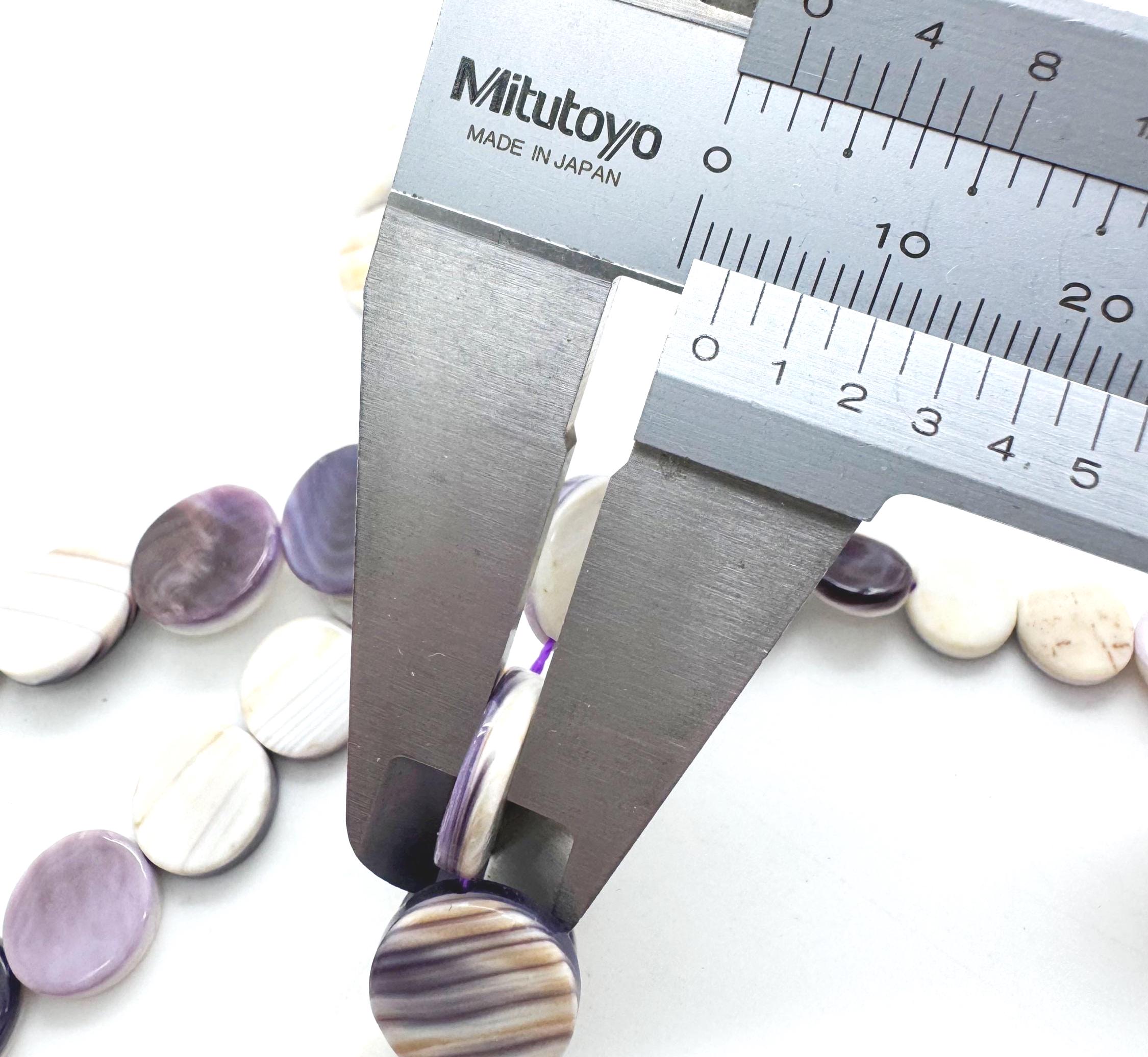 Incorporate the historic beauty of the Atlantic coast into your artisan jewelry with these genuine Wampum (Quahog) shell coin beads. These flat, circular beads are expertly polished to a high luster, showcasing the stunning, high-contrast purple and snowy white banding unique to the Quahog shell. Their slim, "coin" profile allows them to sit comfortably against the skin, making them ideal for modern, sophisticated designs.