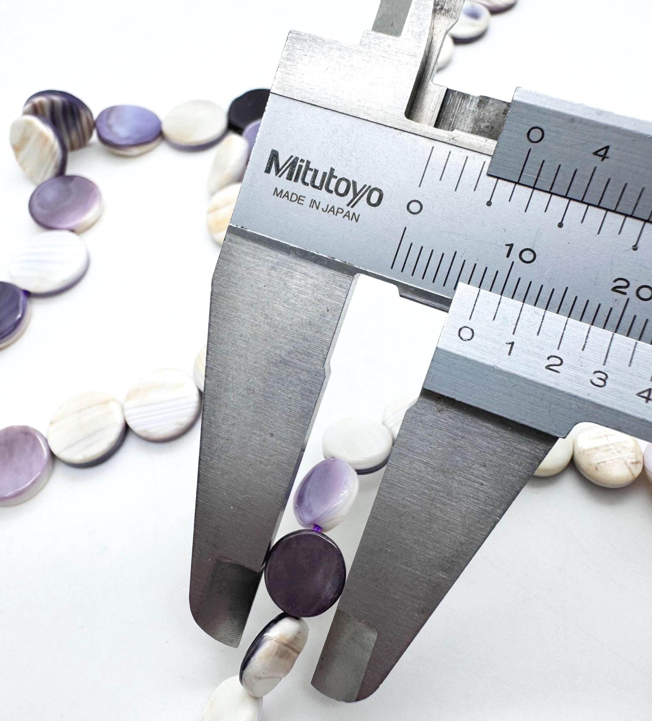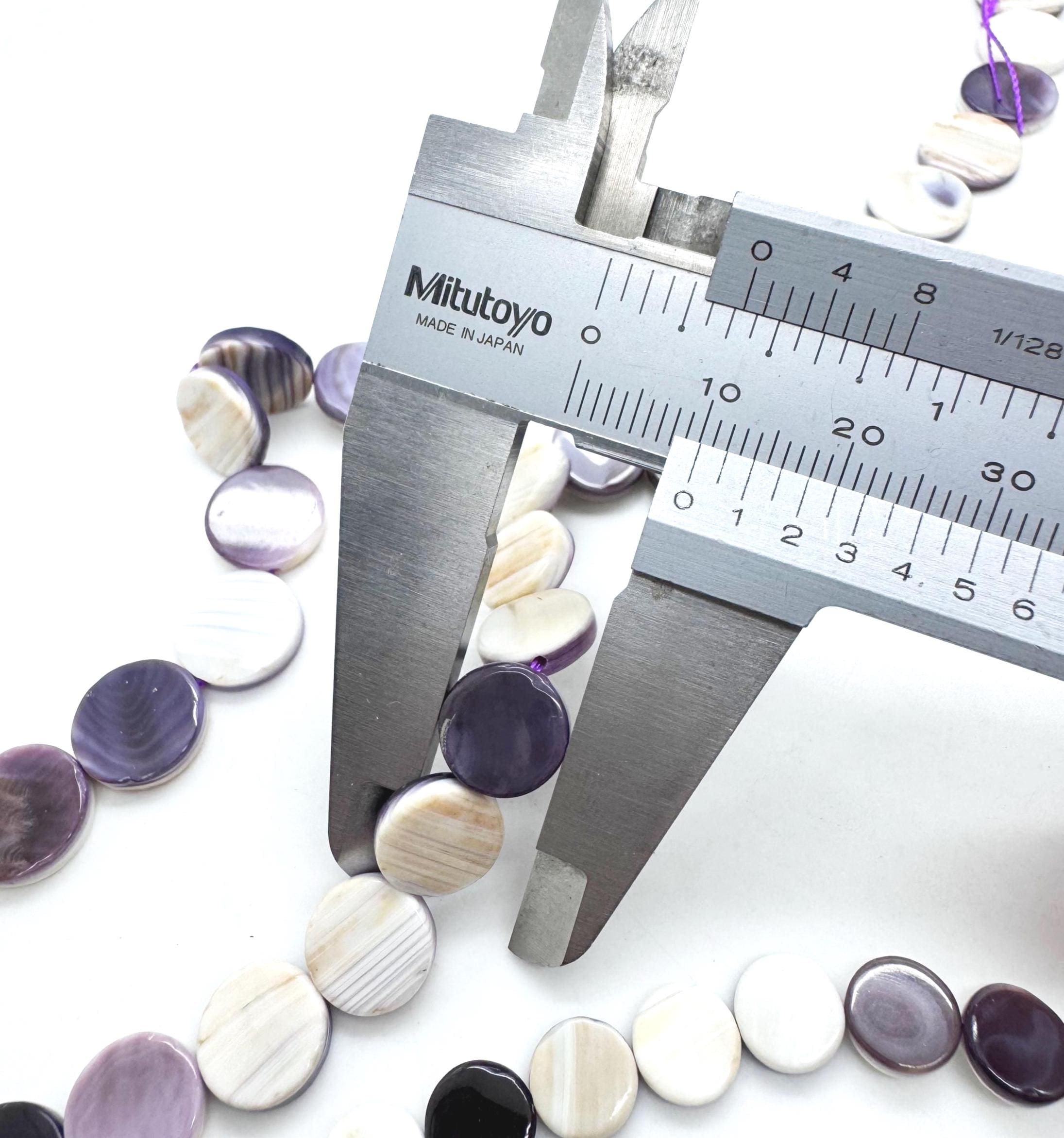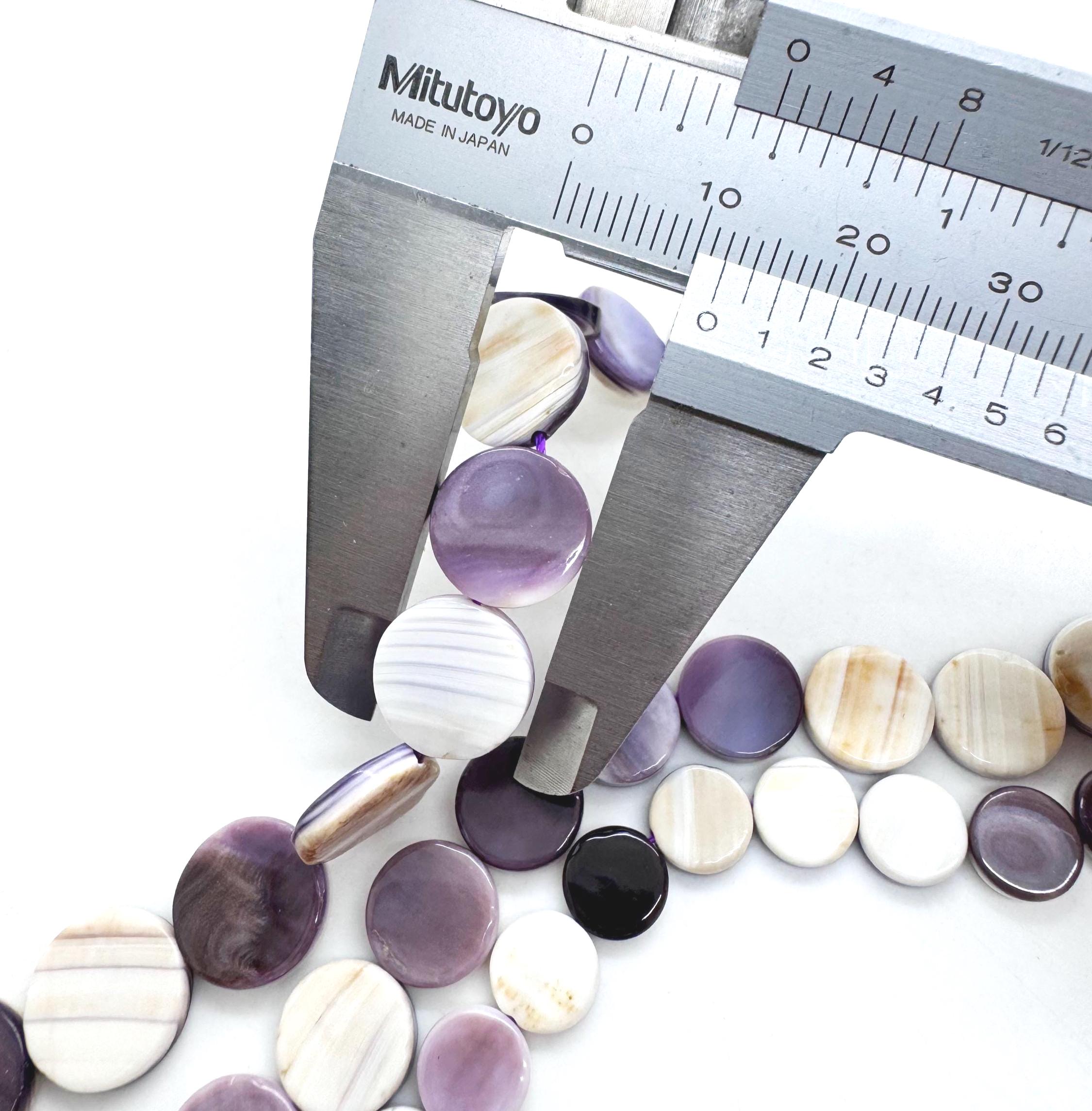 Incorporate the historic beauty of the Atlantic coast into your artisan jewelry with these genuine Wampum (Quahog) shell coin beads. These flat, circular beads are expertly polished to a high luster, showcasing the stunning, high-contrast purple and snowy white banding unique to the Quahog shell. Their slim, "coin" profile allows them to sit comfortably against the skin, making them ideal for modern, sophisticated designs.