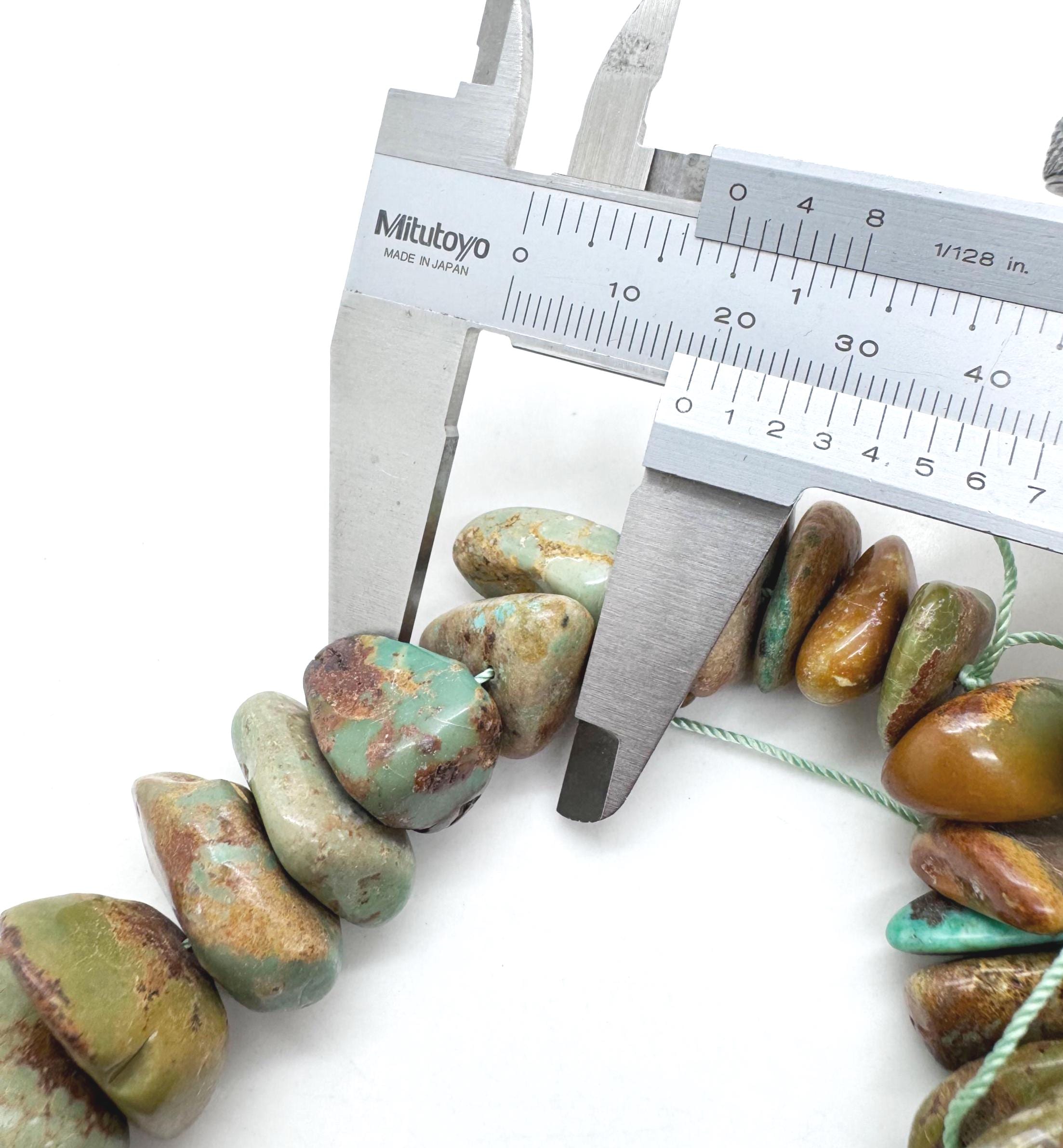 Make an unforgettable impact with this genuine Hubei Turquoise strand. These massive tumbled nuggets are expertly graduated, fanning from a substantial 18mm at the ends to a breathtaking 29mm focal center. Known for its incredible structural character, this Hubei material features a stunning palette of mossy greens, sea-foam teals, and a deep, multi-tonal earthy matrix. Each nugget is polished to a smooth, waxy luster that highlights the stone's complex geological history.
