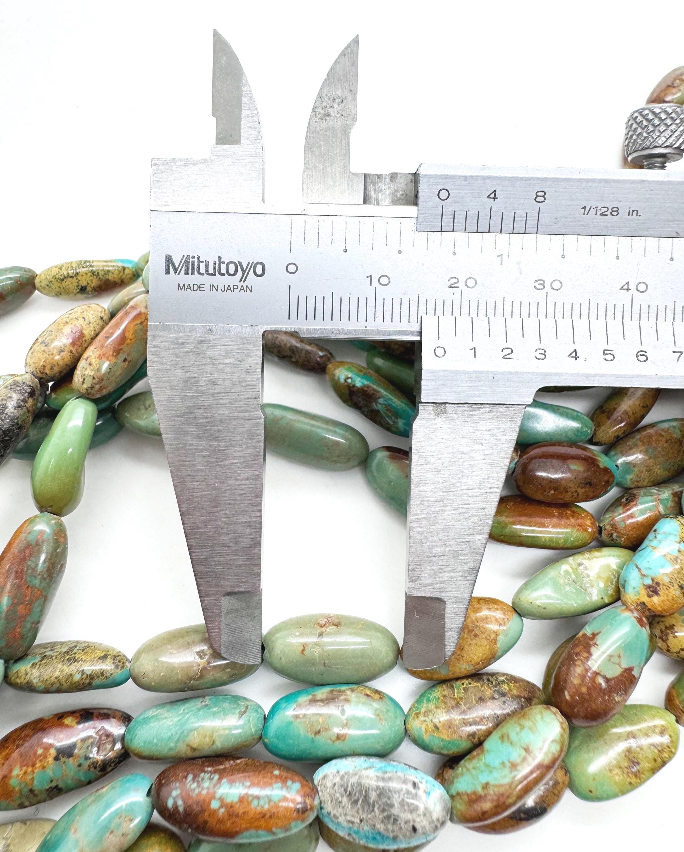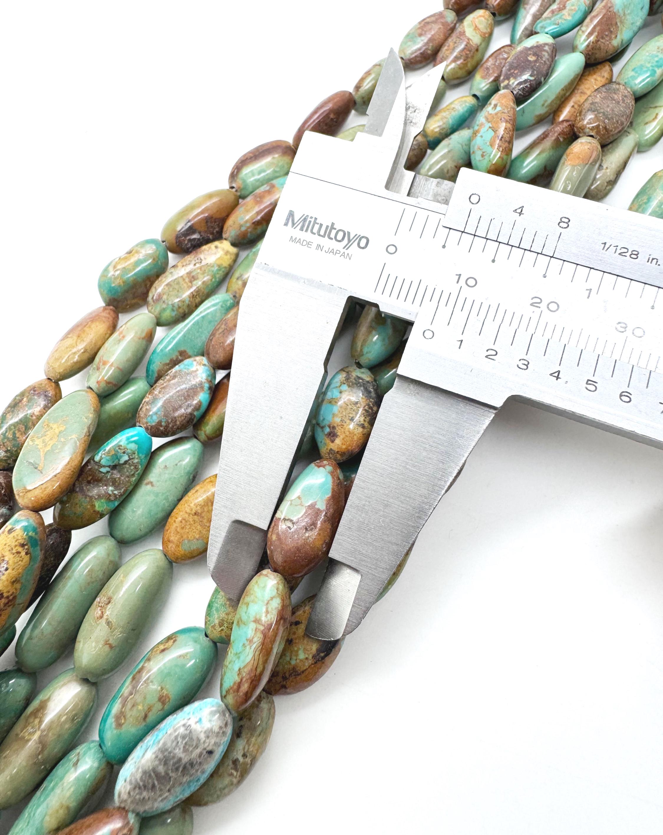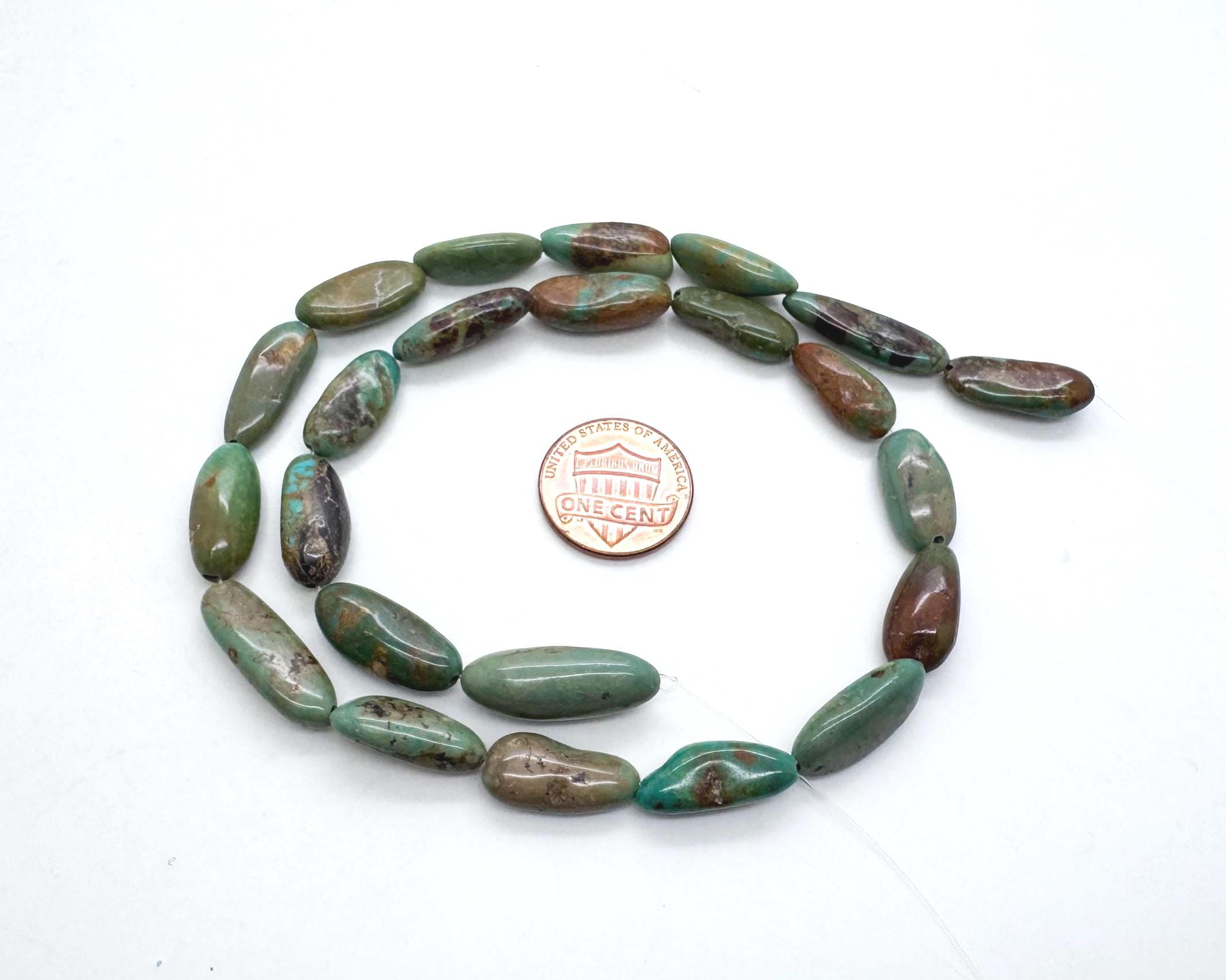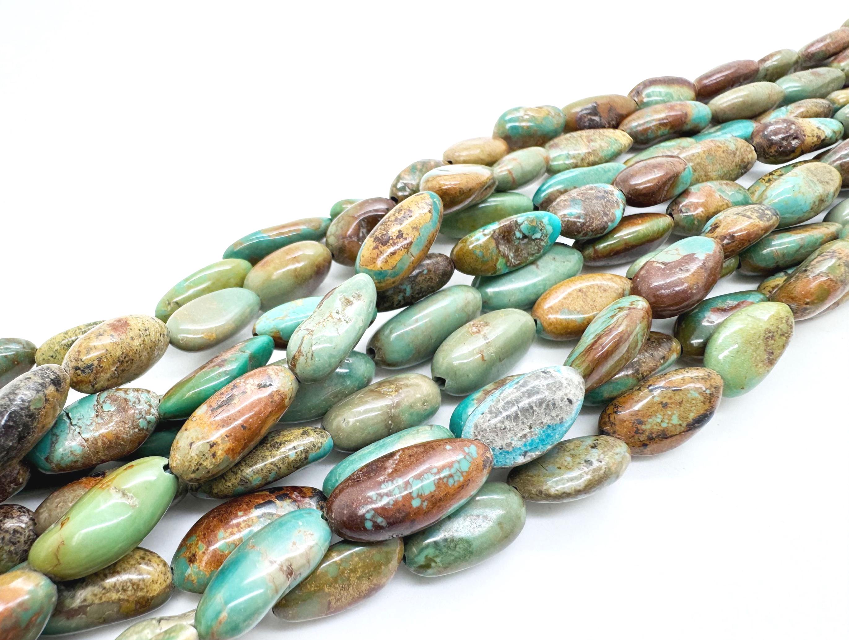 Incorporate the storied beauty of Hubei Turquoise into your next masterpiece. These polished rice-shaped (long oval) beads feature a stunning array of natural mossy greens and deep teals, accented by a complex golden-brown and cocoa matrix. Their elongated silhouette provides a clean, sophisticated line, making them perfect for designs that require both organic texture and a refined, modern shape.