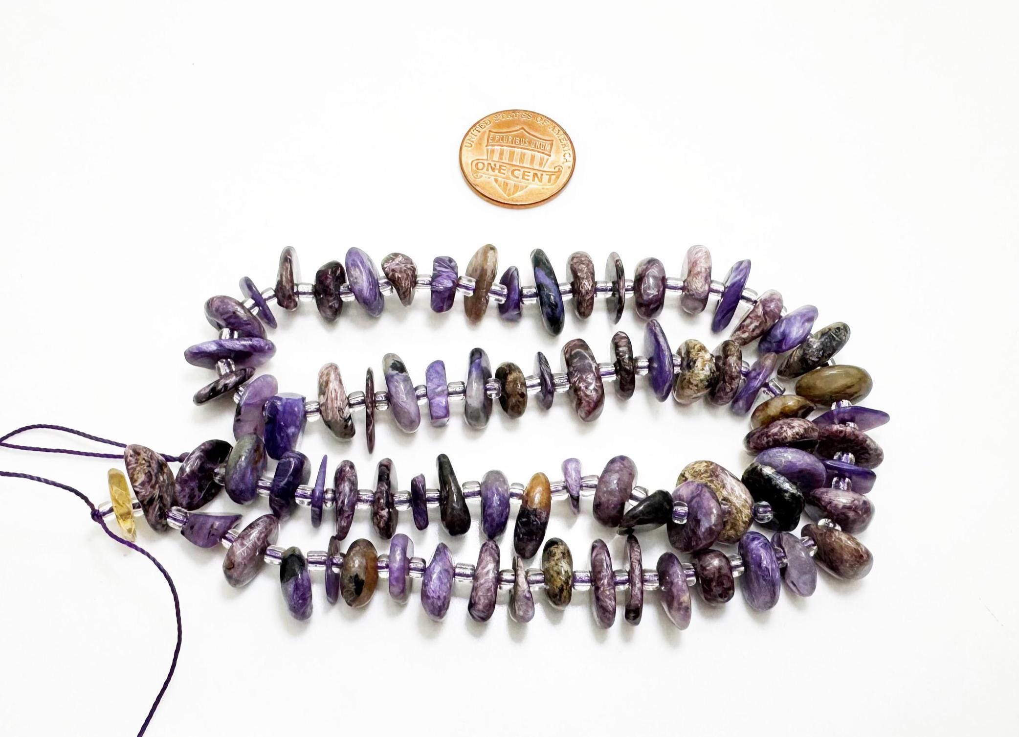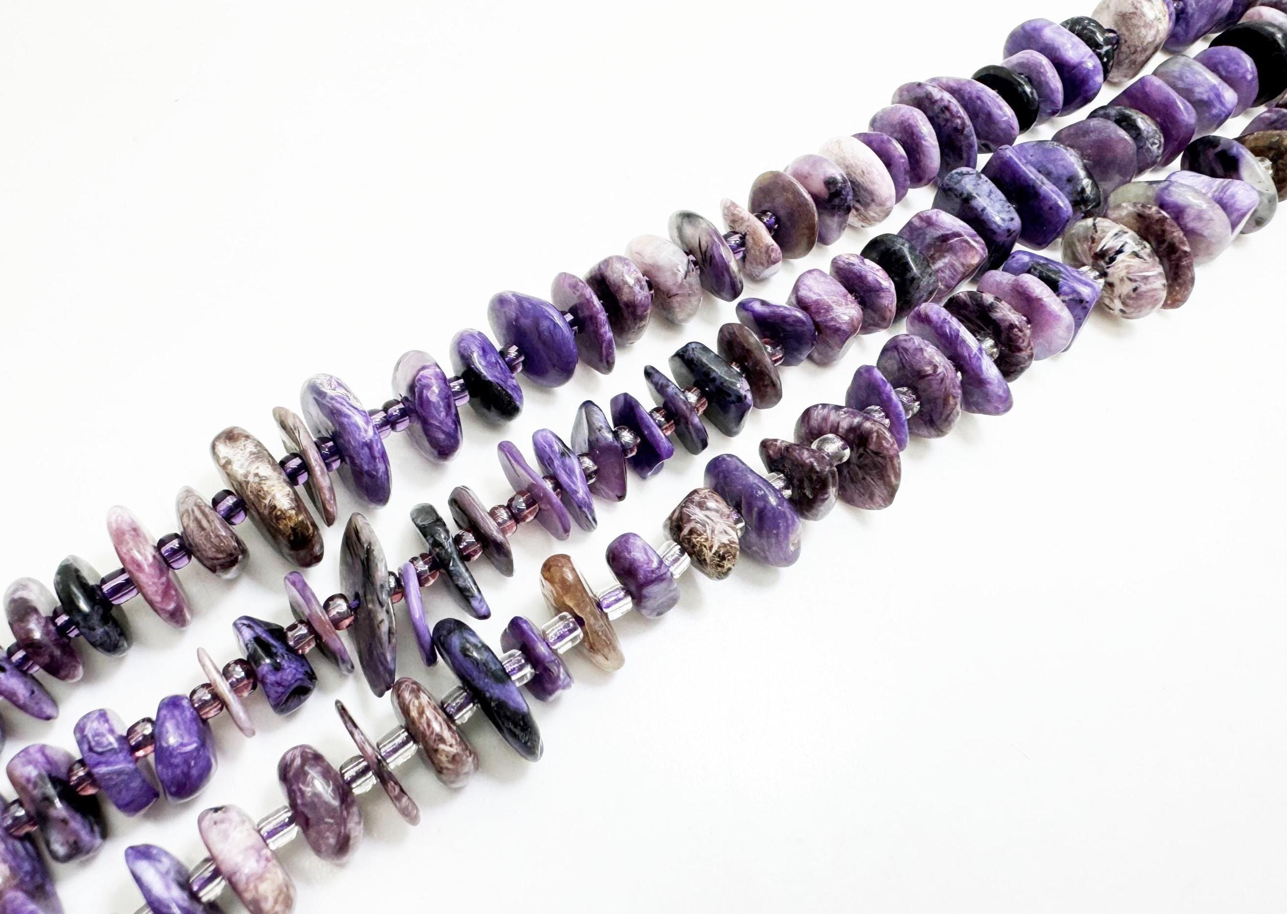 These genuine charoite chip beads feature beautiful shades of purple, lavender, black, and earthy tones with natural marbling. The beads are flatter and more slender than standard chips, giving a delicate, organic look that works beautifully in layered and detailed designs.
